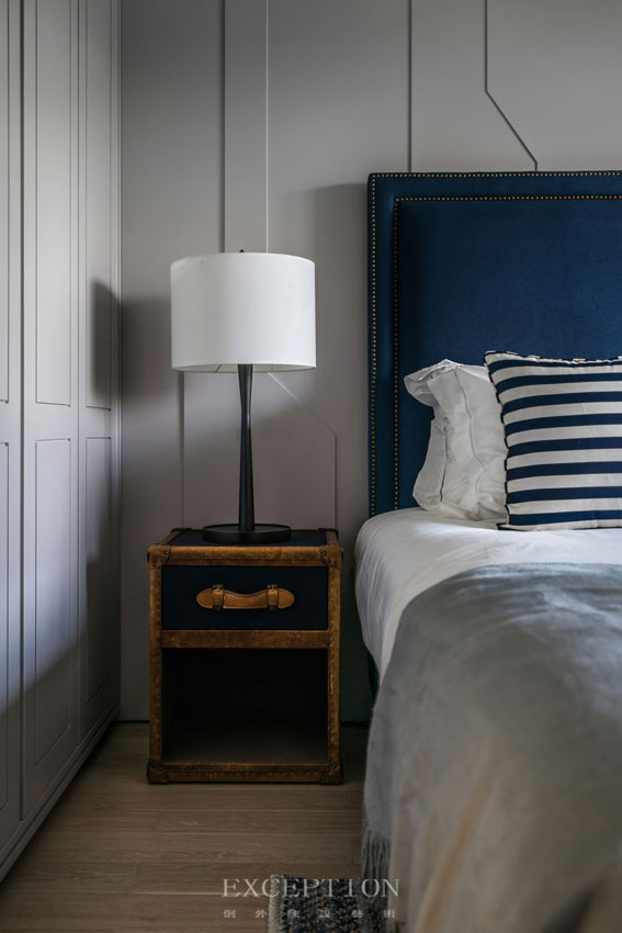 床頭的深藍(lán)來(lái)自心中描繪的海洋世界,描金方柜是那藏著奇妙力量的寶盒,夢(mèng)里的小男孩滿懷勇氣,去追尋心中的秘境。
