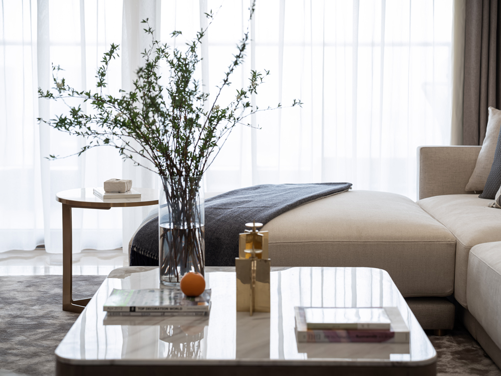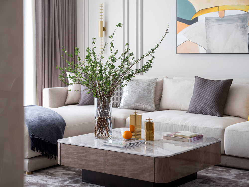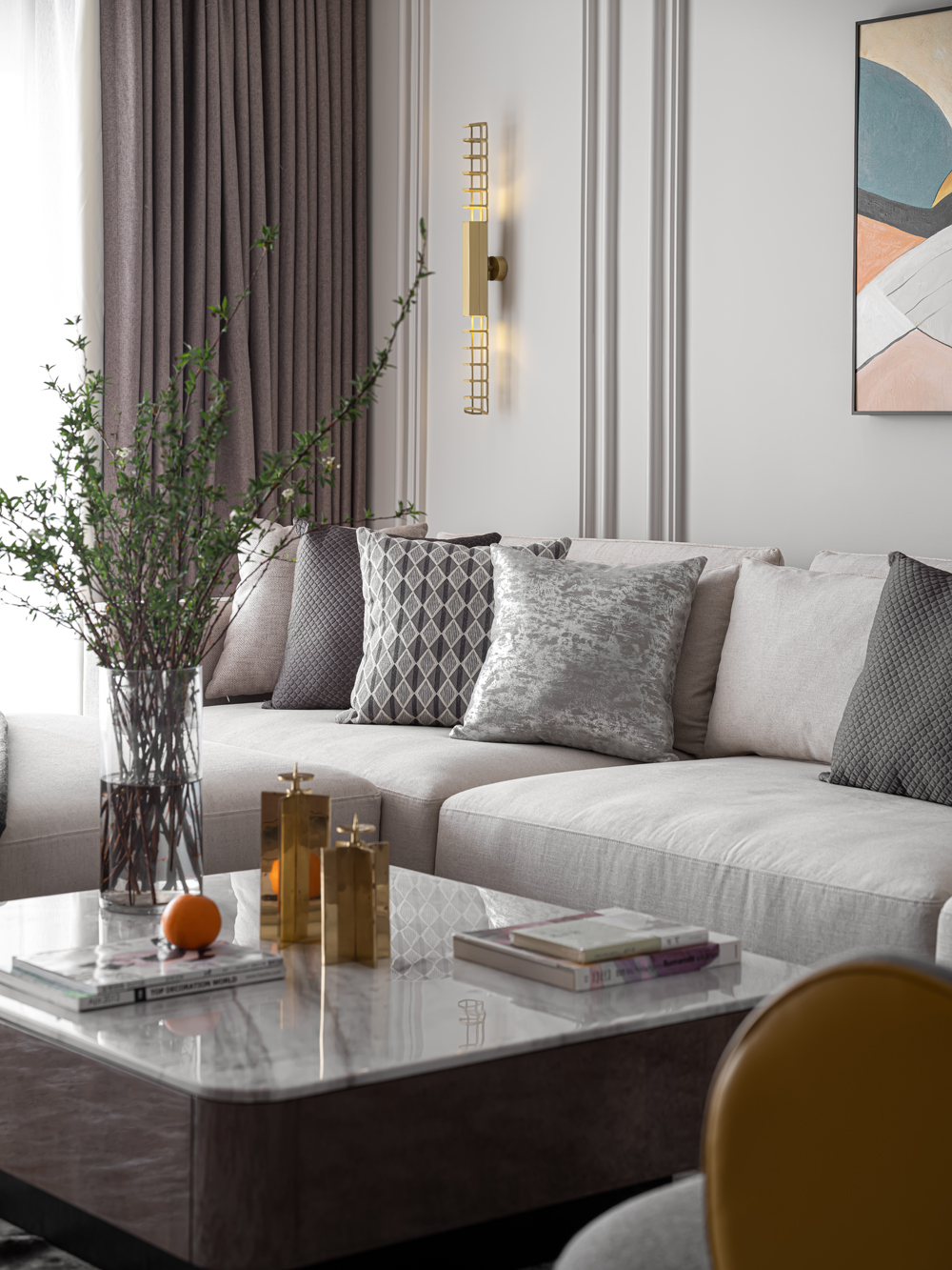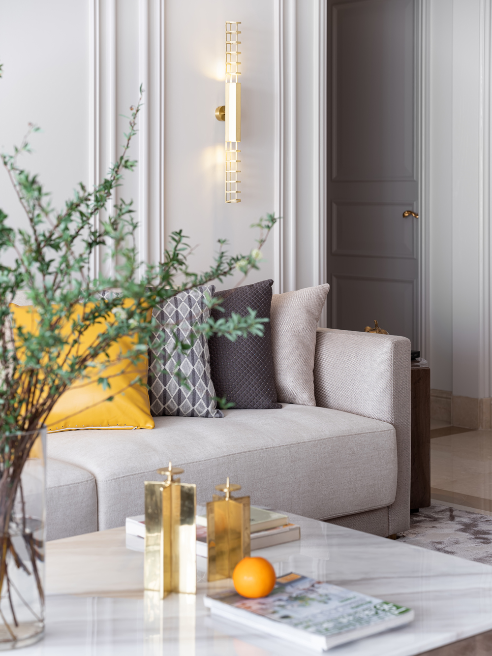 理石材質(zhì)茶幾源于設(shè)計(jì)師的悉心臻選,精致簡(jiǎn)雅而不清冷。鏤空狀金屬壁燈與幾上金色擺件默契無聲,于細(xì)微處流露空間的雅奢韻味。三兩枝花葉清芬搖曳,彌漫一室淡淡的余韻與清寧。