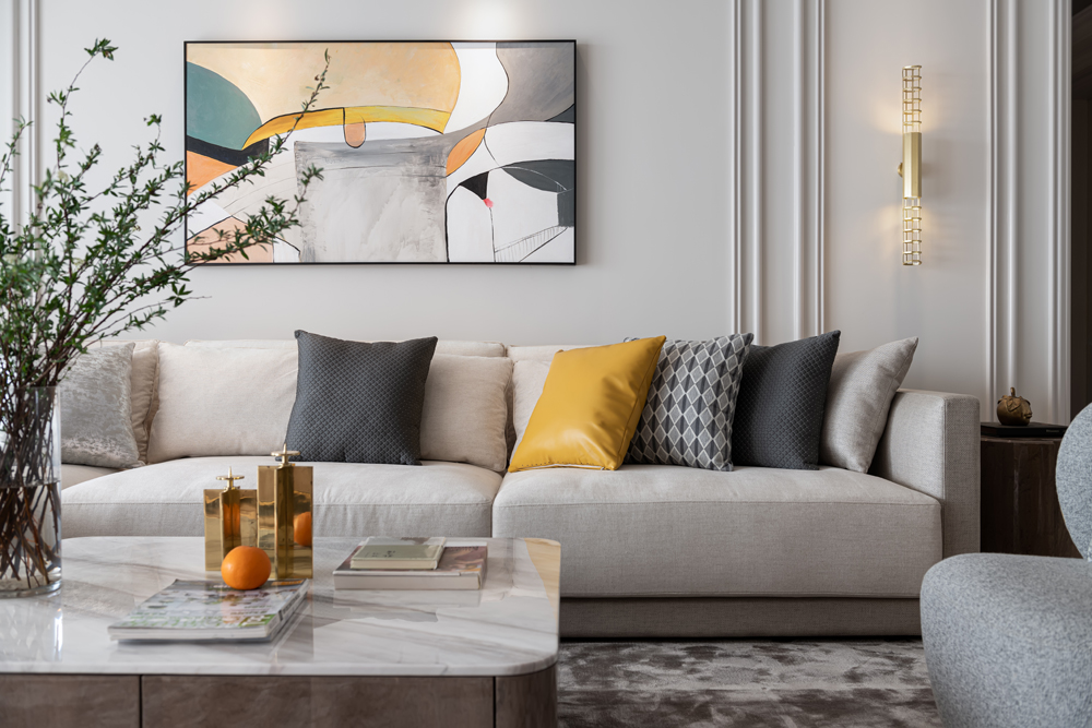 抽象幾何掛畫色彩活潑,與暖橘黃抱枕互相呼應(yīng),傳遞出居者時(shí)尚清新的藝術(shù)品位。清風(fēng)款款,相見言歡,生活明朗,萬物可愛。
