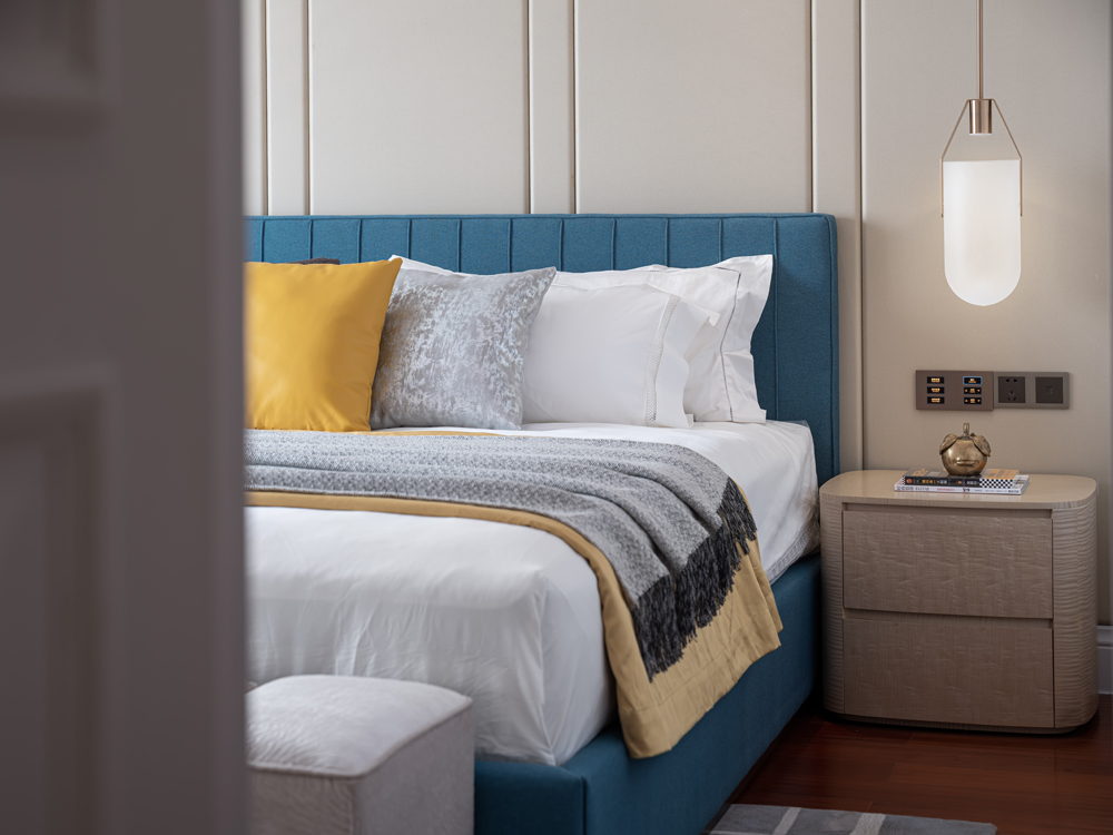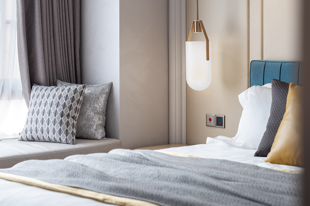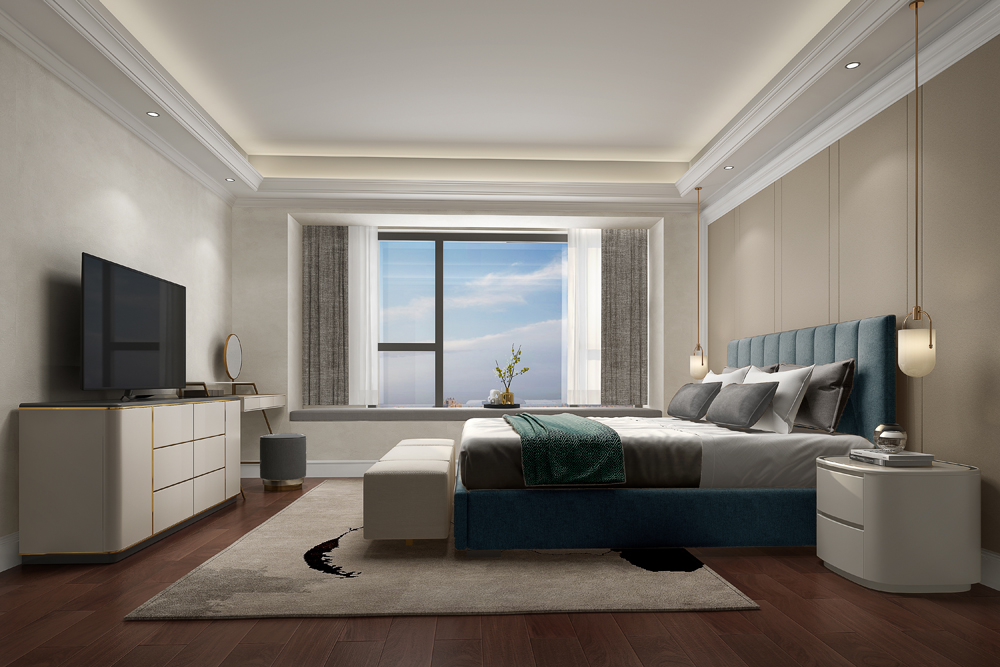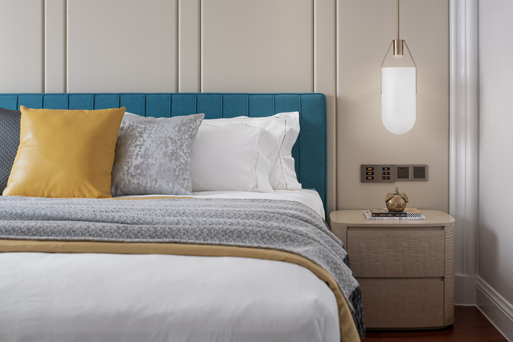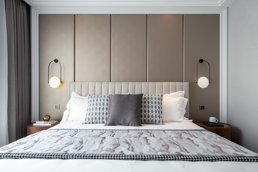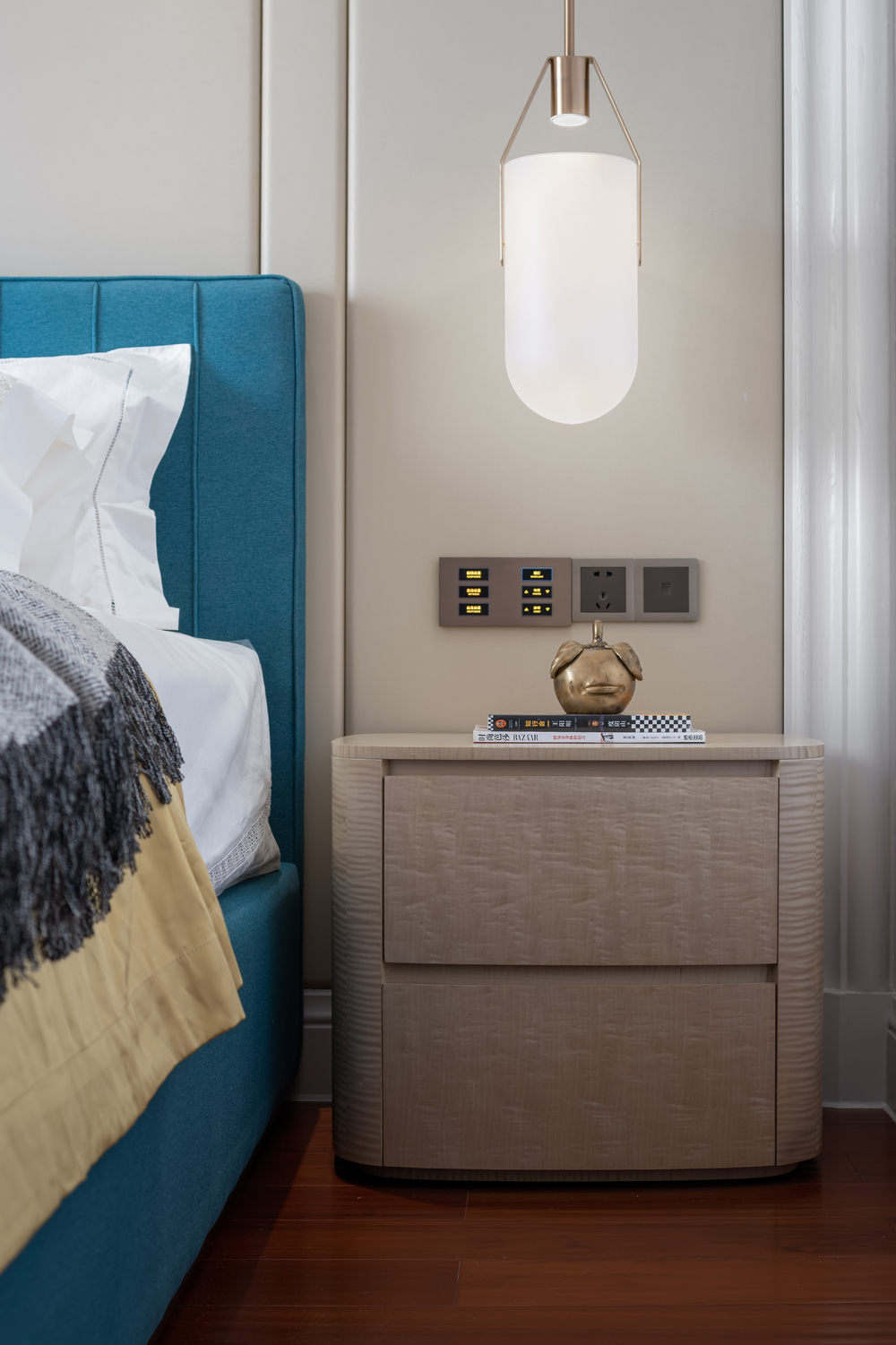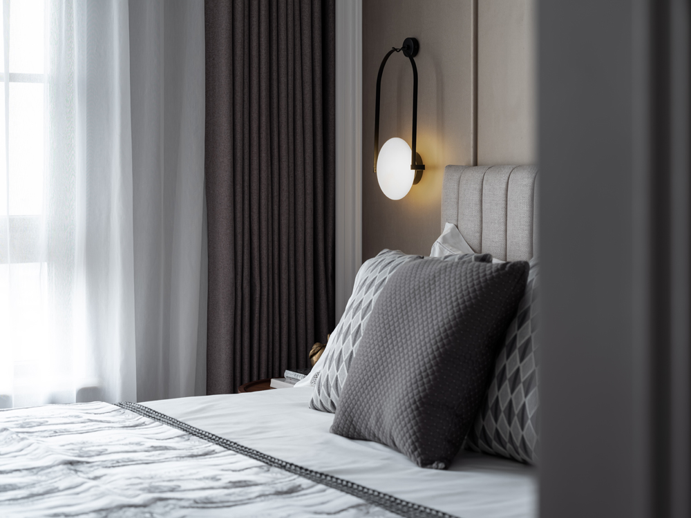 長輩房用色沉穩(wěn)樸質(zhì),米色柔和,灰色大氣,勾勒舒適尊享的氛圍,現(xiàn)代簡(jiǎn)約形制壁燈造型精巧,暖色光暈烘托起溫馨有愛的生活場(chǎng)景。