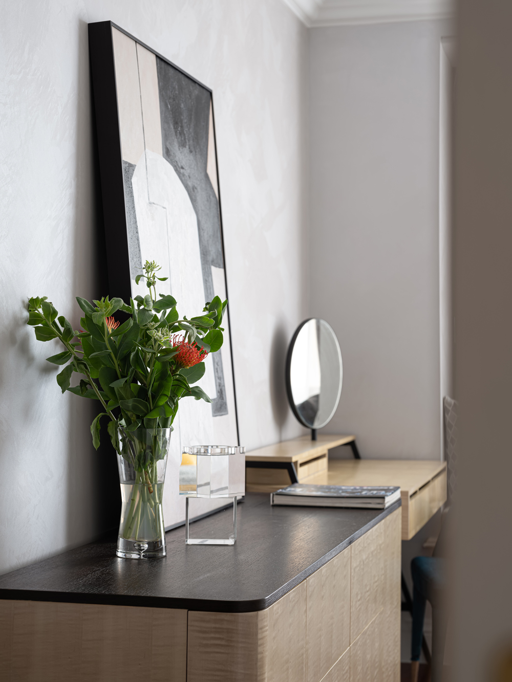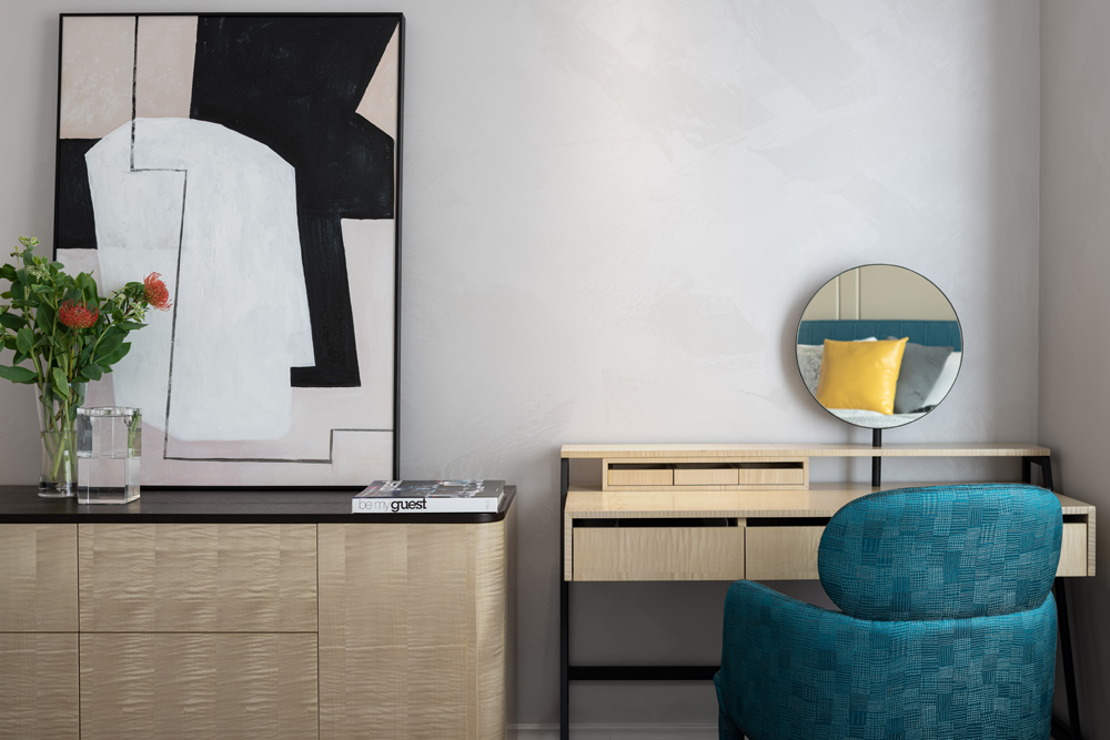 肌理豐腴、層次多變的梳妝椅是女主人鐘愛的一方天地,鏡前賞心悅目,鏡中凝望且深情,不經(jīng)意間就是一幕日常恩愛的故事。