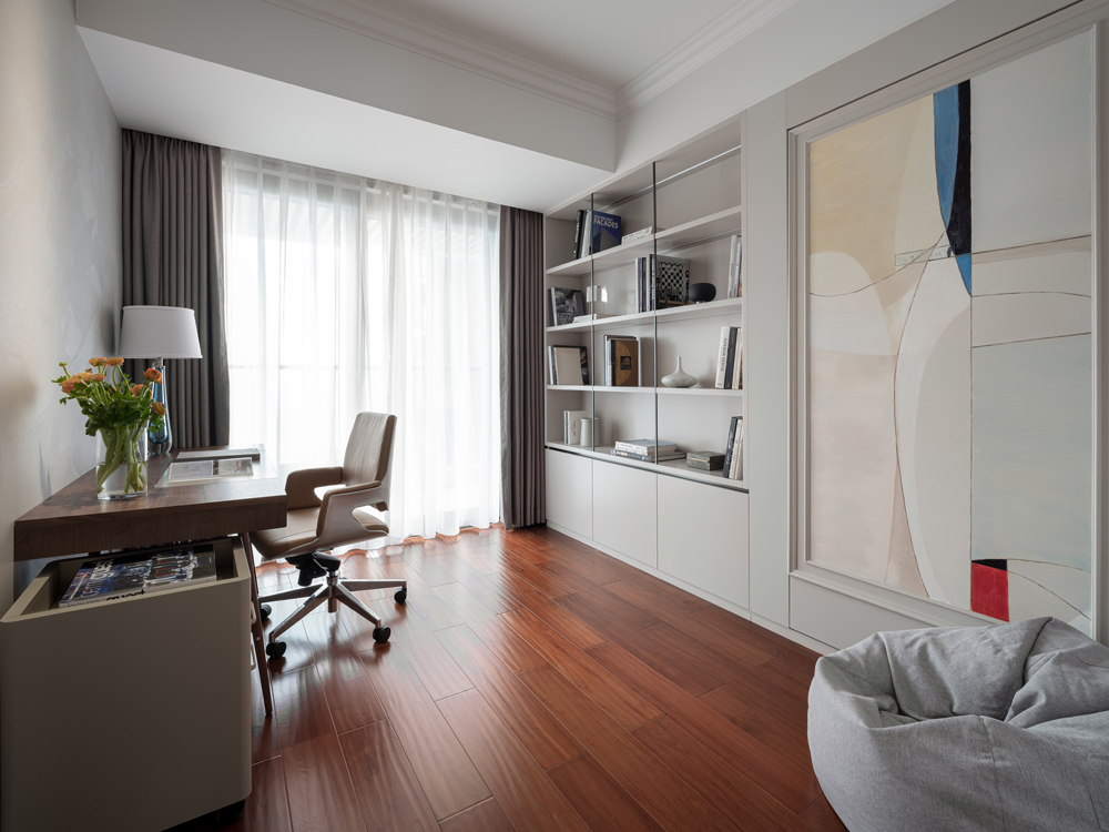 多功能房兼顧書房、臥室、休閑區(qū)的自由切換,隨著抽象手繪畫推拉門的移動(dòng),空間瞬間轉(zhuǎn)換成下翻床休憩模式,隨處可見的書櫥設(shè)計(jì)構(gòu)設(shè)起家人隨時(shí)隨地都能看書的休閑場(chǎng)景,盡顯實(shí)用美學(xué)的內(nèi)在魅力。