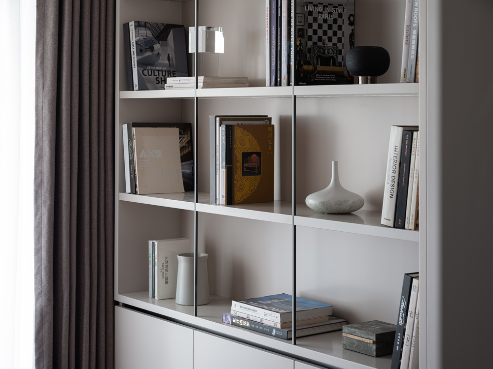 2.在客餐廳分別設(shè)計(jì)了對(duì)稱陳列的儲(chǔ)物柜,解決居家收納問題,同時(shí)在空間的各個(gè)角落設(shè)計(jì)了書櫥,滿足居者隨時(shí)隨地可以拿起書籍翻閱的場(chǎng)景化需求。
