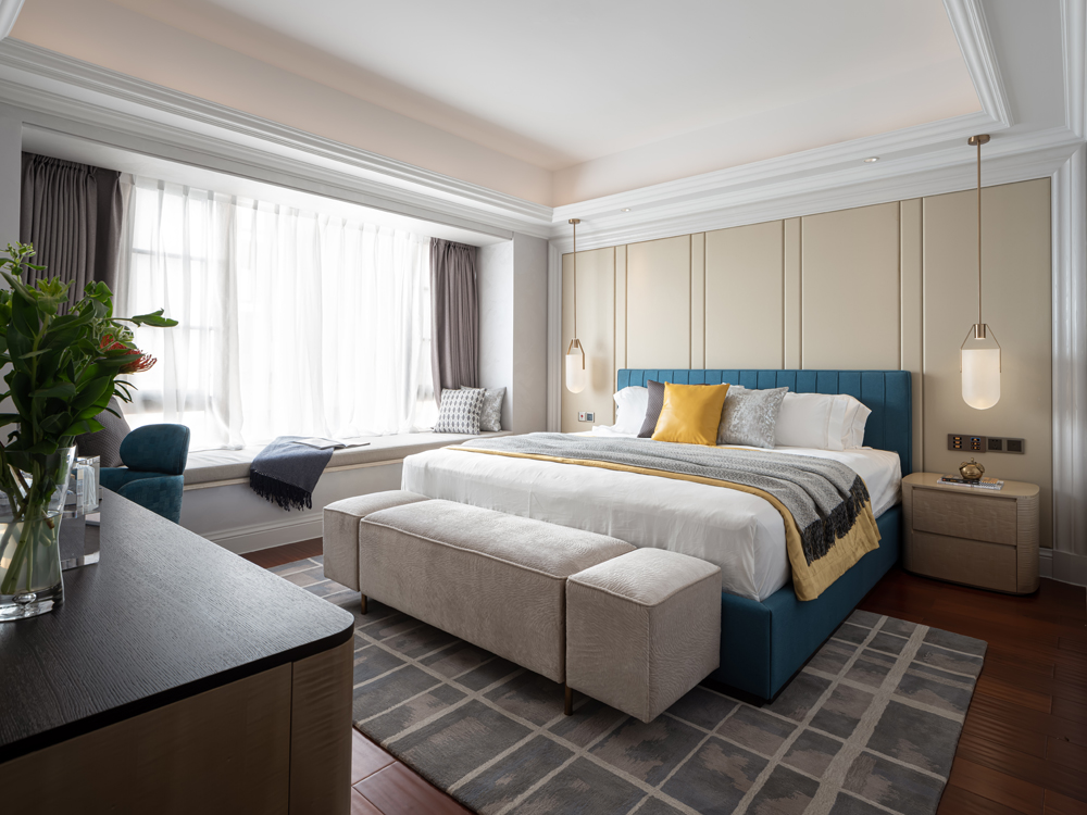 主臥精心搭配的物件創(chuàng)造空間的細(xì)膩情境,于細(xì)節(jié)里盛放余韻悠長的藝術(shù)感。鴻藝源設(shè)計(jì)認(rèn)為家宅的美必須是私人訂制化的呈現(xiàn),從純粹高雅的空間布局再到材質(zhì)的甄選中,主人的居住品位如清風(fēng)明月一般,絲絲入扣。