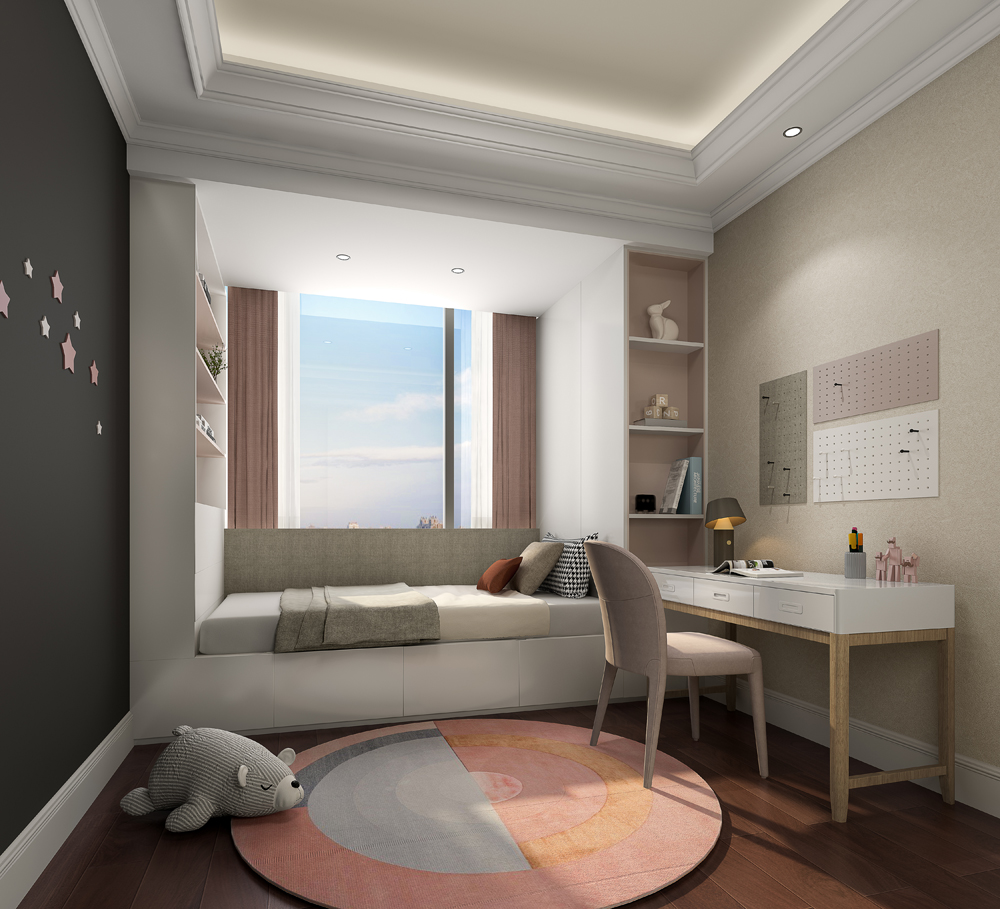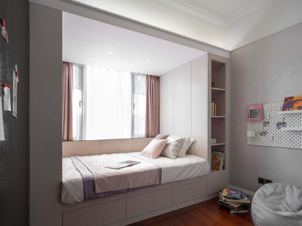 女兒房通過櫻語粉制造童話般的情境,呵護(hù)柔軟的公主夢(mèng)。設(shè)計(jì)考慮實(shí)用與童趣并存的狀態(tài),洞洞板置物架與黑板墻相得益彰,豐富多樣的畫本、值得珍藏的兒童畫作,讓孩童的天真爛漫盡顯眼前。