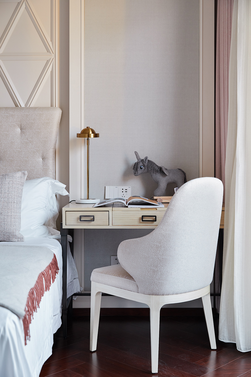 長輩房設(shè)置在一樓,給予長者通行走動的便利,同時也多了與自然相擁的機會。全明落地窗攝入更多的光線,靜靜感受生活明媚的美好。米色調(diào)統(tǒng)籌了空間視覺的舒適度,設(shè)計用精簡的家具取代華而不實的堆砌,空間里流連著簡凝清雅的氣質(zhì),寧然而愜意。