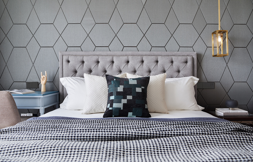 男孩房床頭背景是經(jīng)過變幻后的蜂巢概念,規(guī)整的幾何排布益于孩子思維的拓展開發(fā),不同色塊的組合與千鳥格的搭配,是一種潛移默化的美學(xué)投射,孩子自由成長不受限。