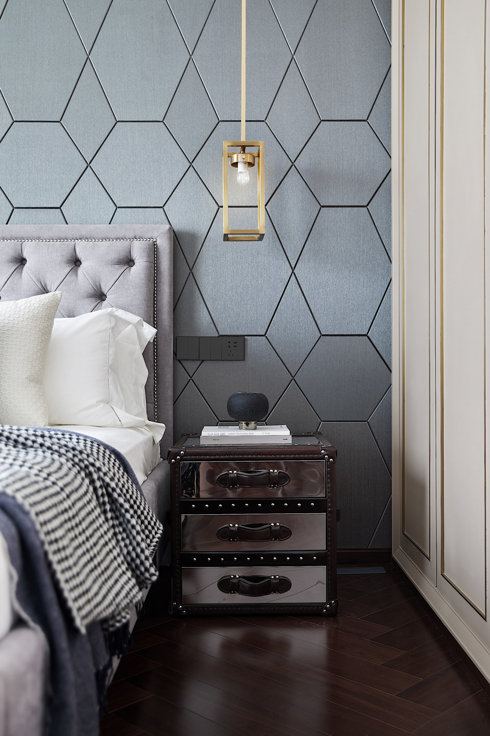 床頭以輕柔的軟包打造,趣味多元的幾何線條勾勒出個性的視覺張力,令空間在低飽和度的色彩中跳脫出輕靈的節(jié)奏感,生活與藝術(shù)在此靜謐融合。