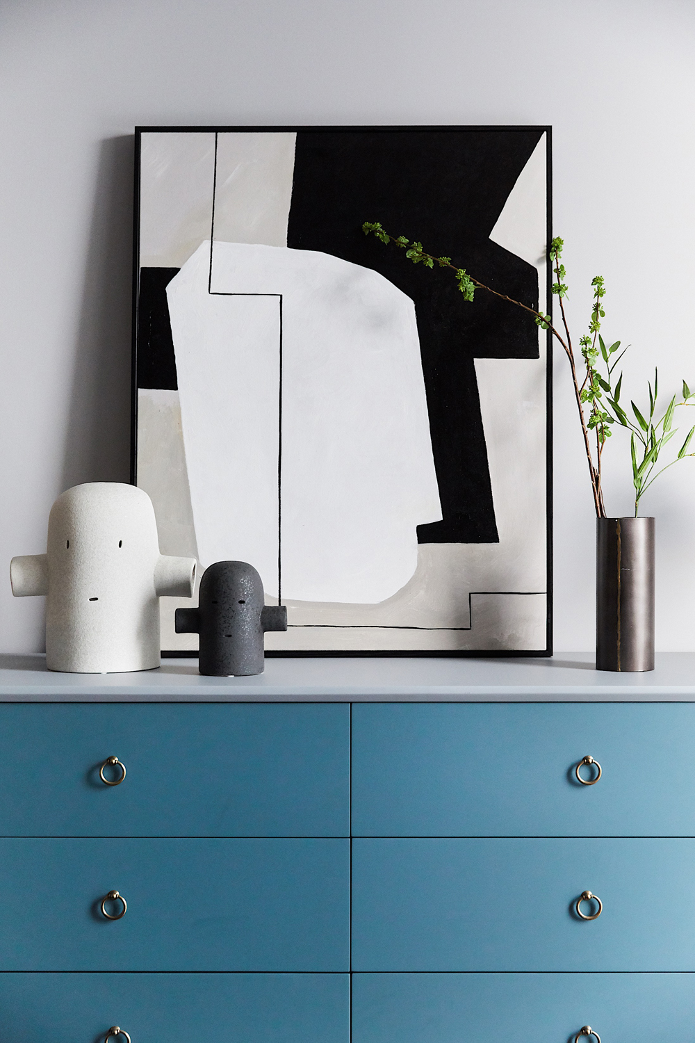 書房位于主臥套房中,空間井然有序,頂天立地式書櫥陳列著居者的藝術(shù)藏品,身后柜門上抽象手繪畫更是將溫厚的人文氣質(zhì)刻畫得淋漓盡致,書中錦繡三千,任居者肆意揮灑。