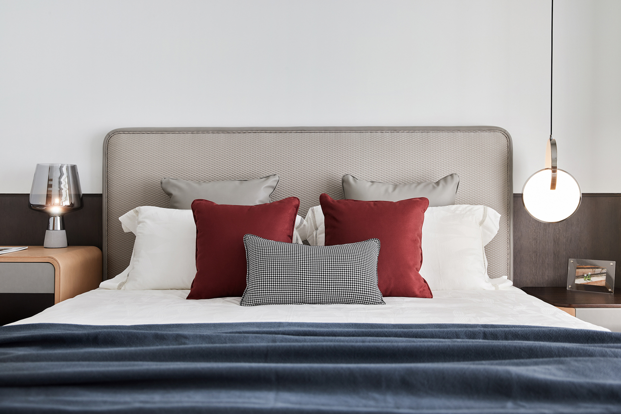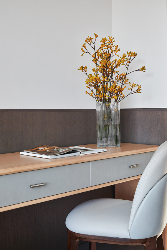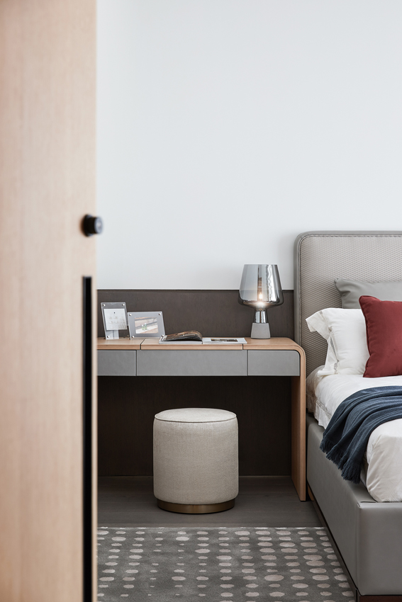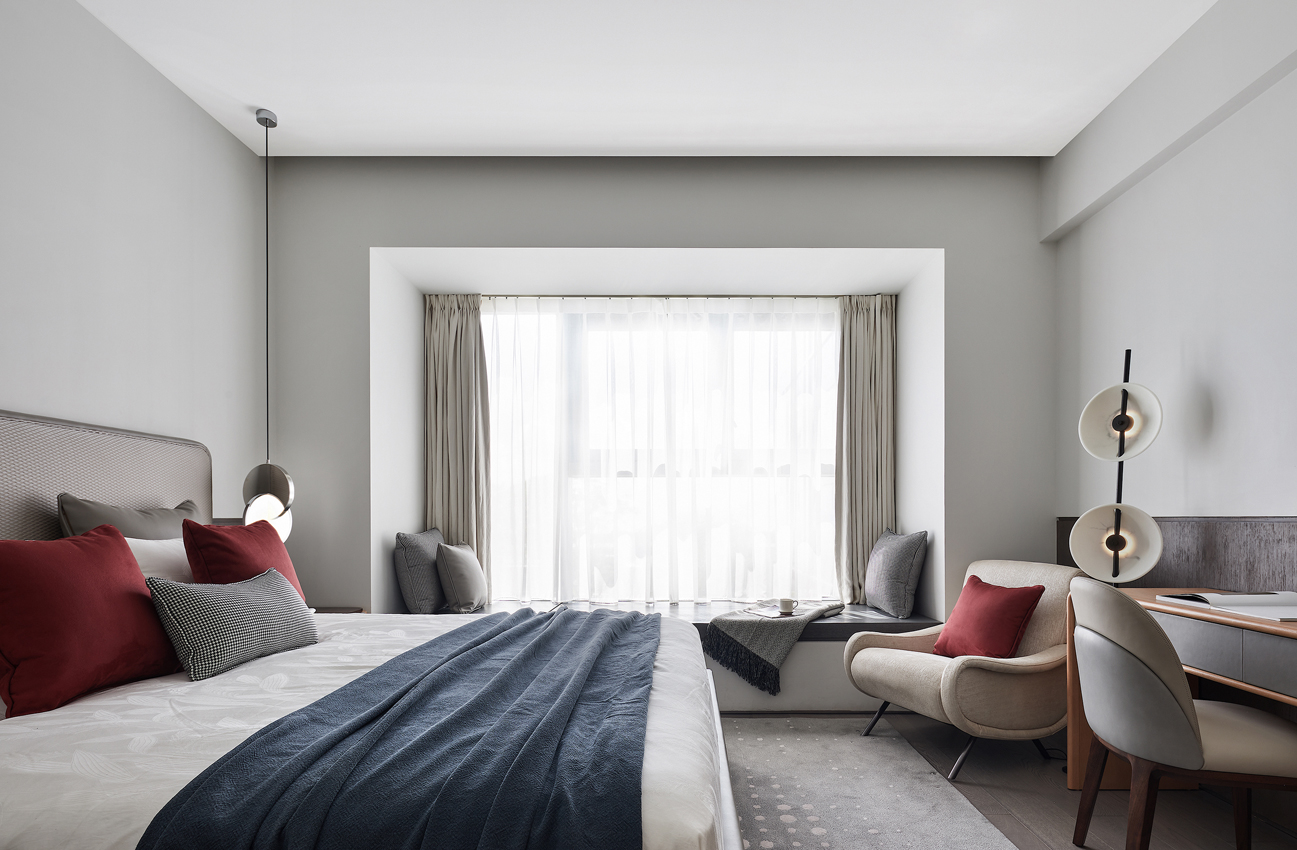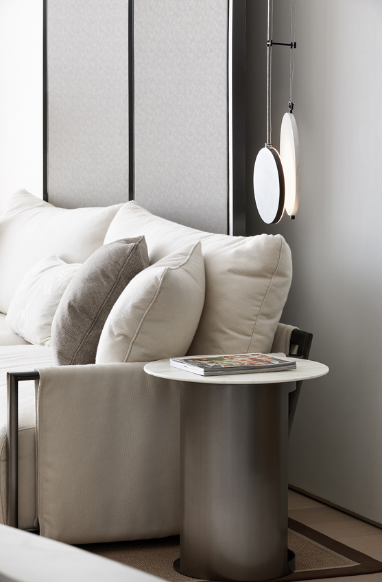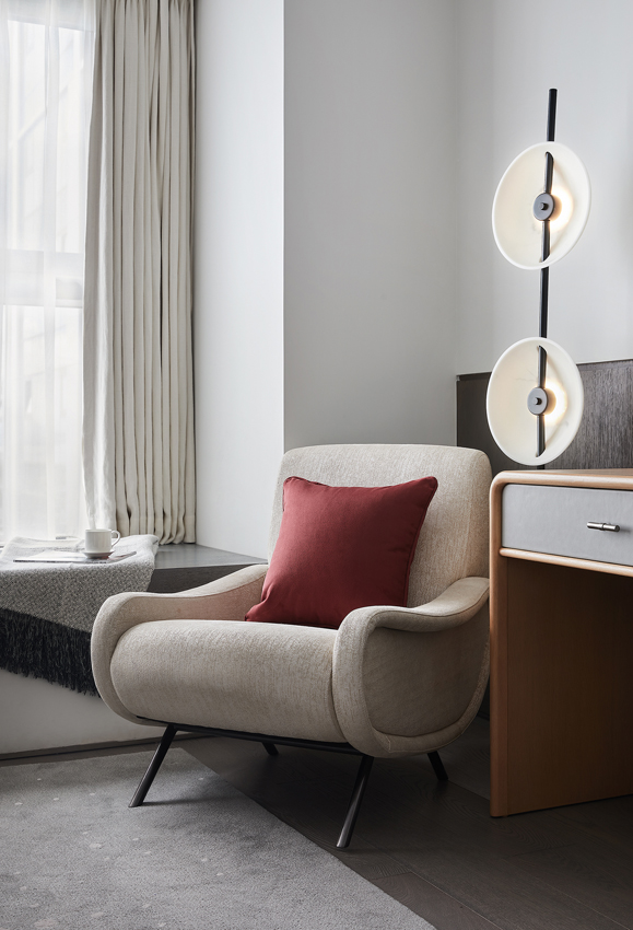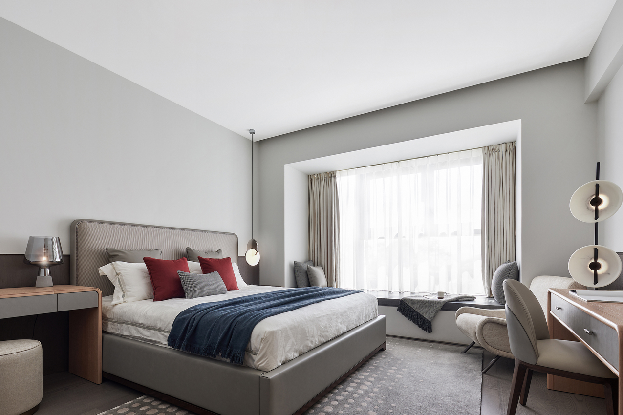海德格爾說:“詩(shī)意的棲居,不應(yīng)該只是觀看的詩(shī)意,而是居住的詩(shī)意?!痹O(shè)計(jì)通過深淺不一的灰色打造舒適奢享的空間氛圍。富于肌理與光澤的床品、造型精巧的臺(tái)燈,窗臺(tái)小憩的休閑場(chǎng)景,都經(jīng)過設(shè)計(jì)師精心的考量,為居者呈現(xiàn)定制化的品質(zhì)體驗(yàn)。