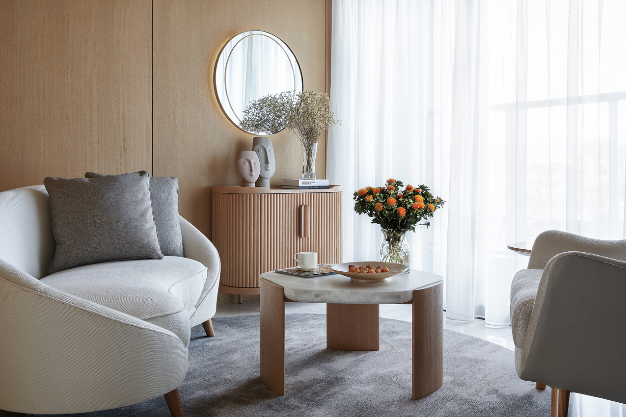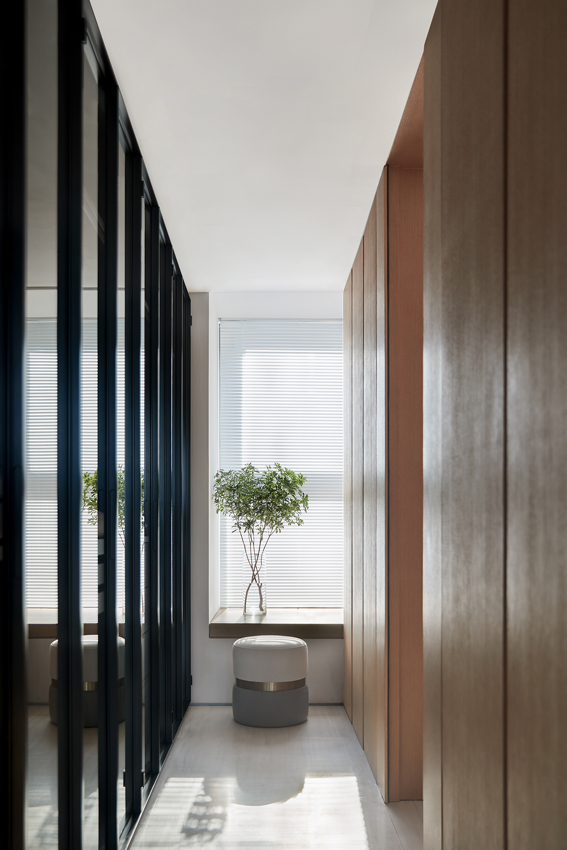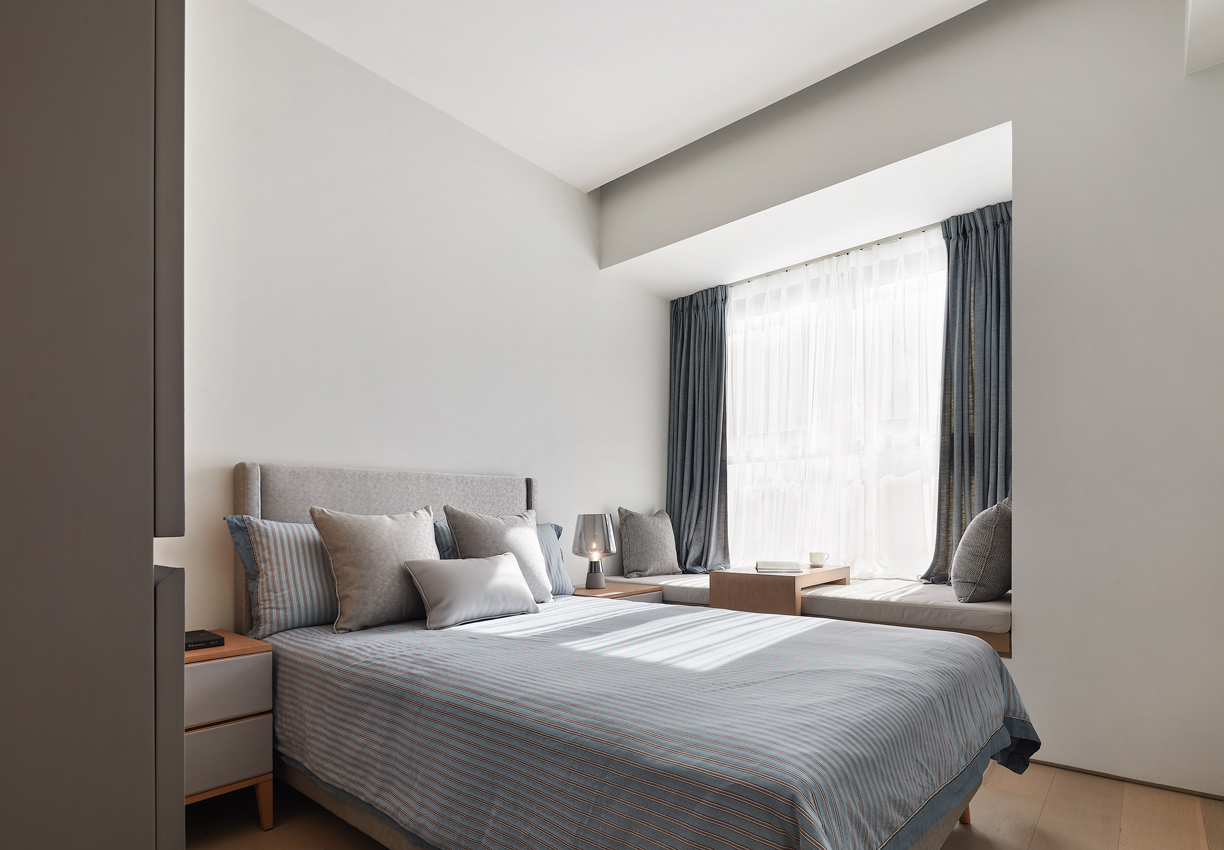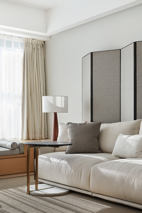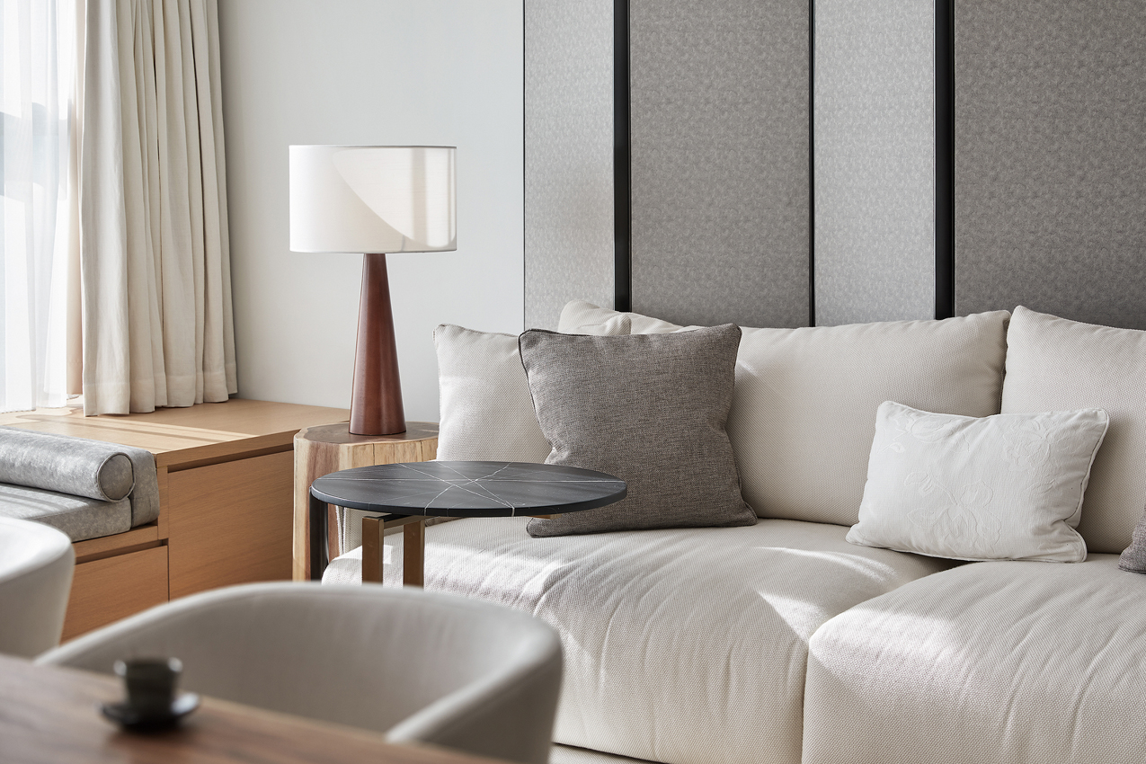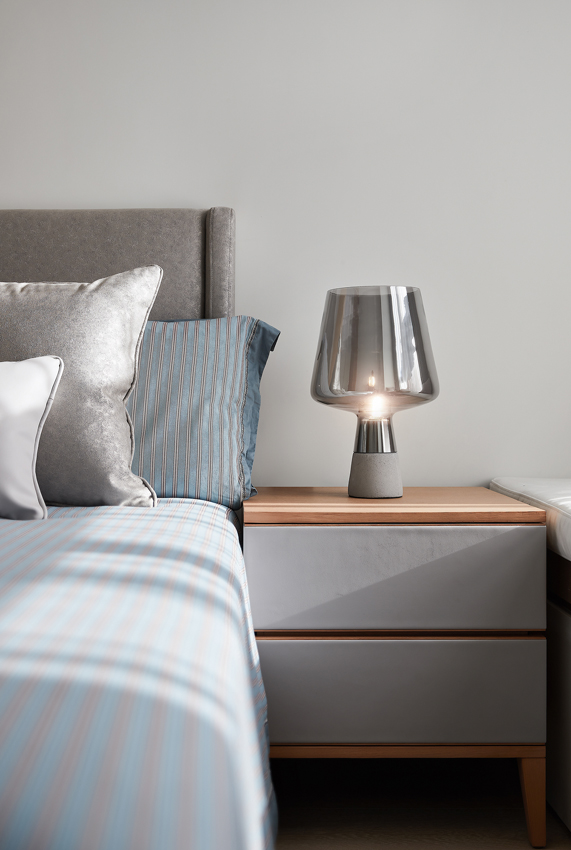 海德格爾說:“詩(shī)意的棲居,不應(yīng)該只是觀看的詩(shī)意,而是居住的詩(shī)意?!痹O(shè)計(jì)通過深淺不一的灰色打造舒適奢享的空間氛圍。富于肌理與光澤的床品、造型精巧的臺(tái)燈,窗臺(tái)小憩的休閑場(chǎng)景,都經(jīng)過設(shè)計(jì)師精心的考量,為居者呈現(xiàn)定制化的品質(zhì)體驗(yàn)。