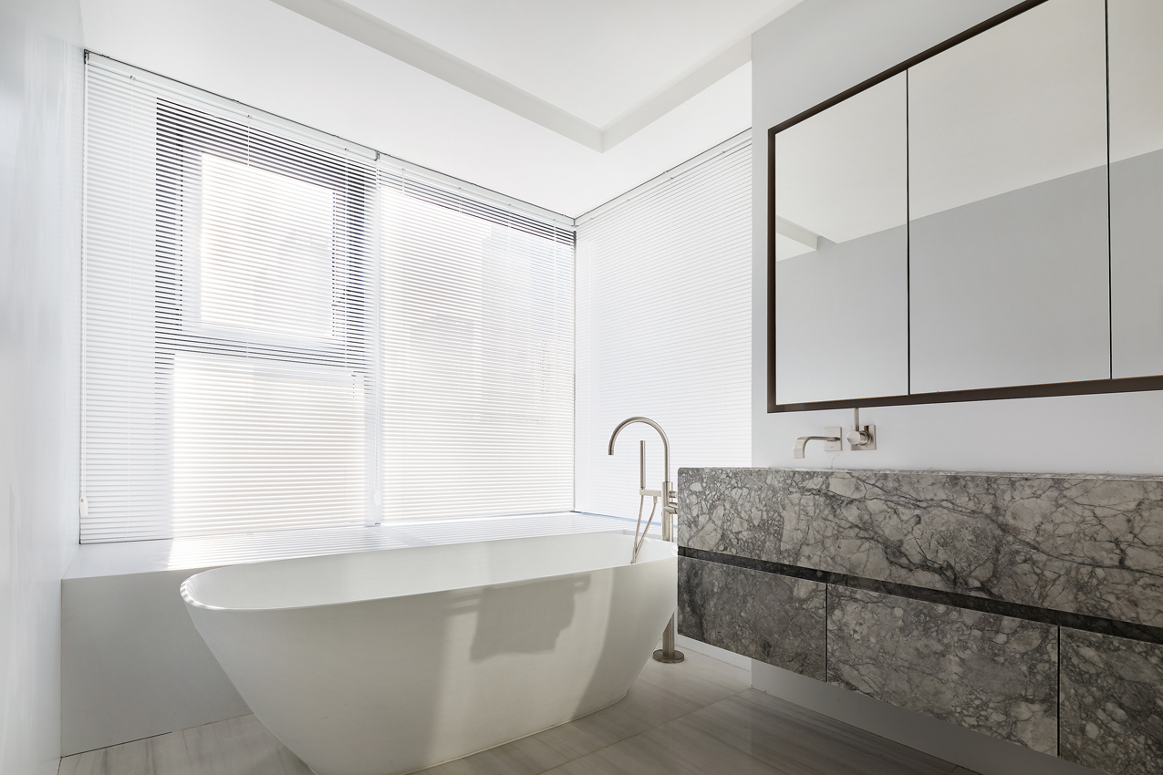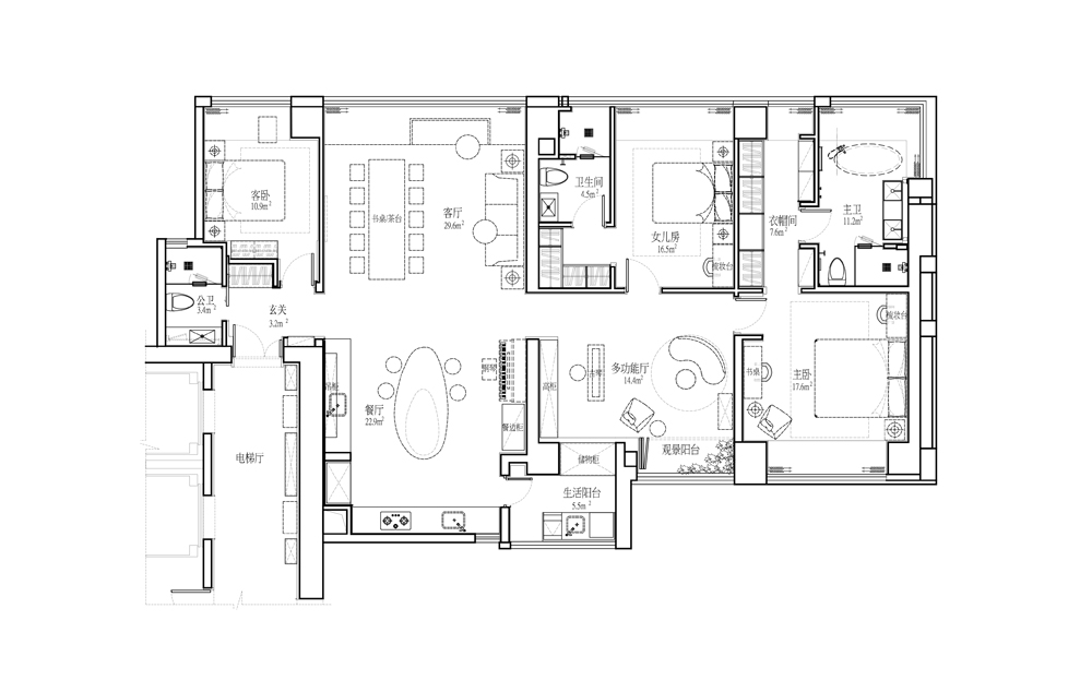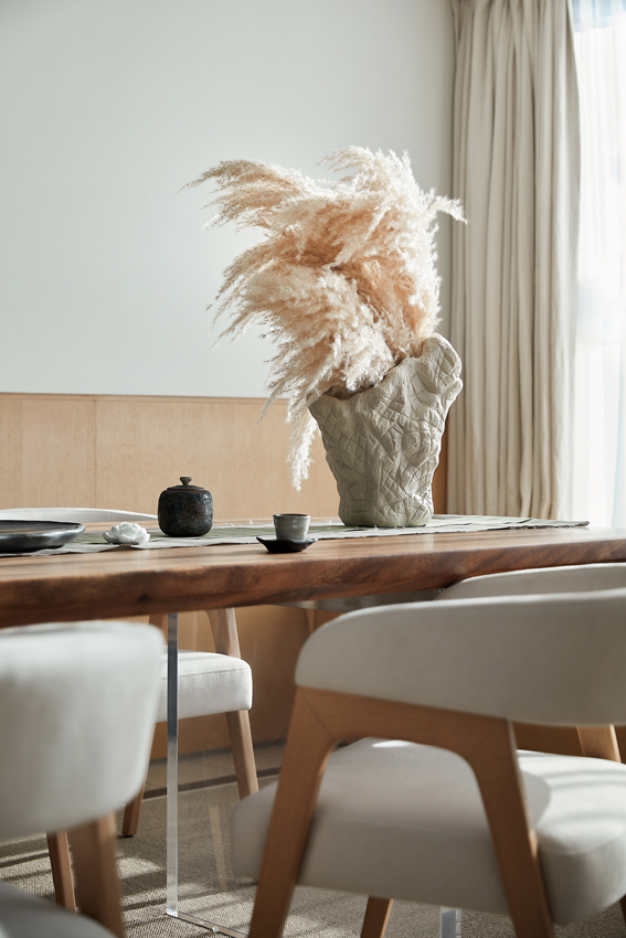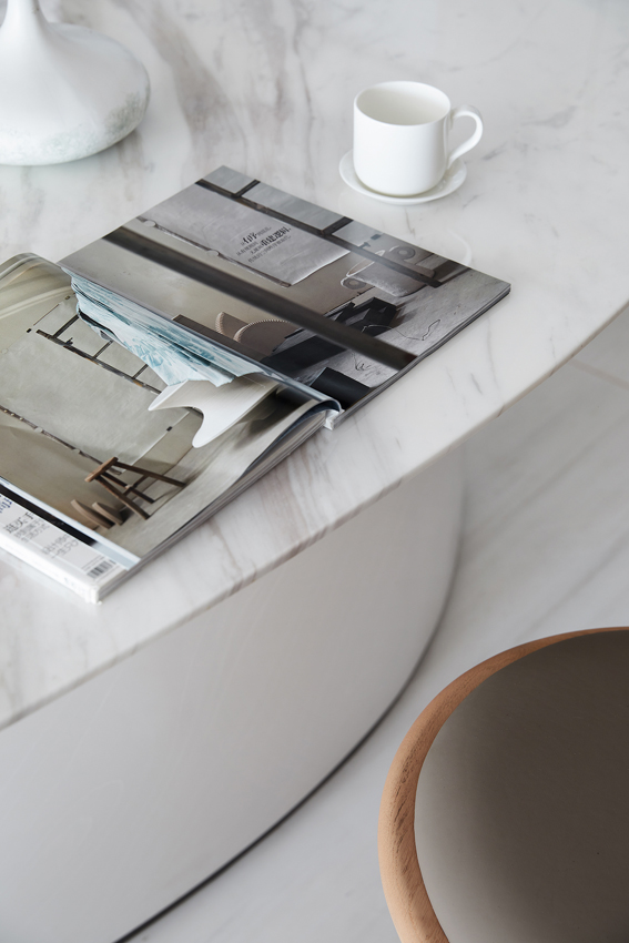 能為幸福的家錦上添花,是設(shè)計(jì)師對(duì)空間最虔誠(chéng)的致意。如輕舟般翩然的島臺(tái)是設(shè)計(jì)師徐靜的特別創(chuàng)作,隱藏式的收納,明凈的視感,自然的石材肌理,配合游刃自如的空間情境,素雅輕靈,滿含著三餐四時(shí)的生活哲學(xué)。