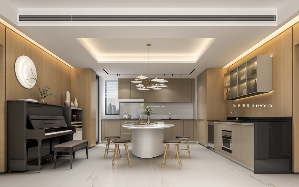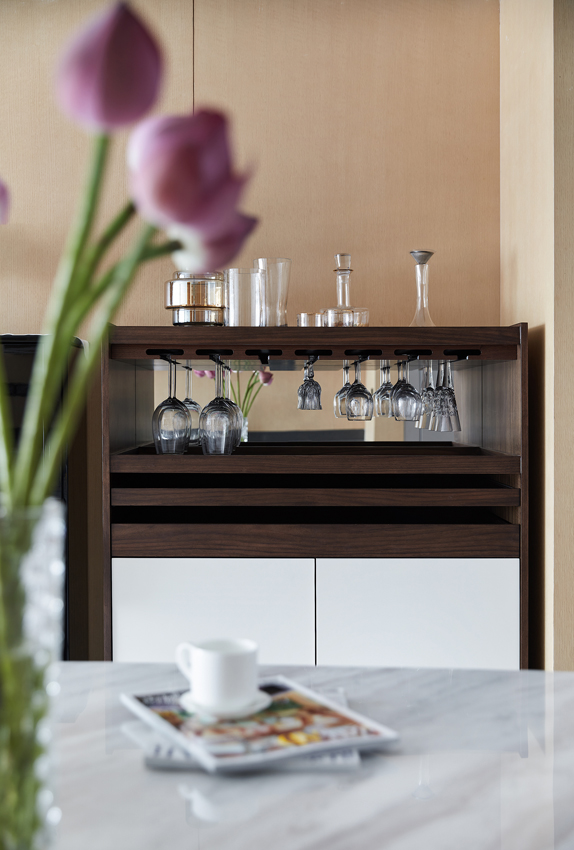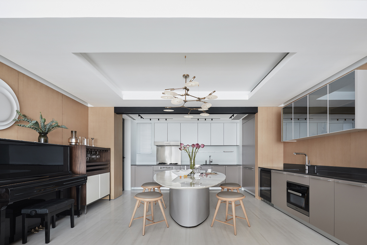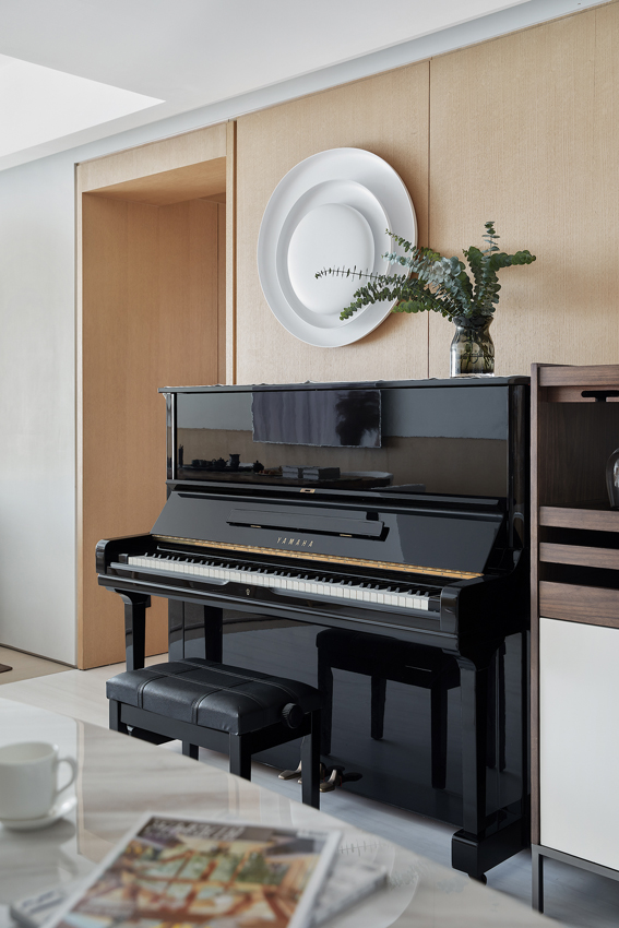 在設(shè)計(jì)師徐靜看來,當(dāng)設(shè)計(jì)更多地在審視空間的互動(dòng)性和人的參與感時(shí),便有了家的人情味。開放式餐廚布局增加了更多互動(dòng)的場(chǎng)景感,女兒心愛的鋼琴與簡(jiǎn)雅實(shí)用的酒柜倚墻而設(shè),將每一寸空間利用到極致,藝術(shù)與生活于此實(shí)現(xiàn)了潤(rùn)物無聲的自然交融。