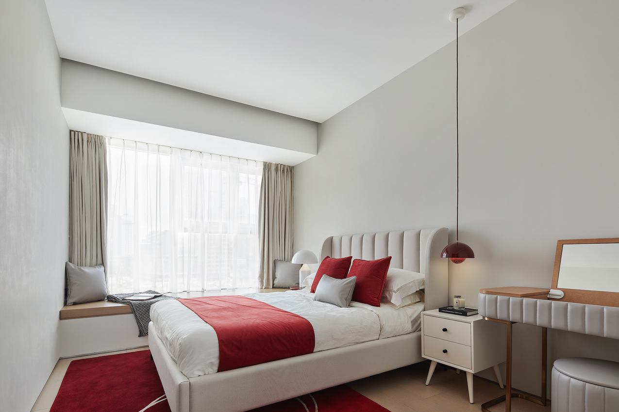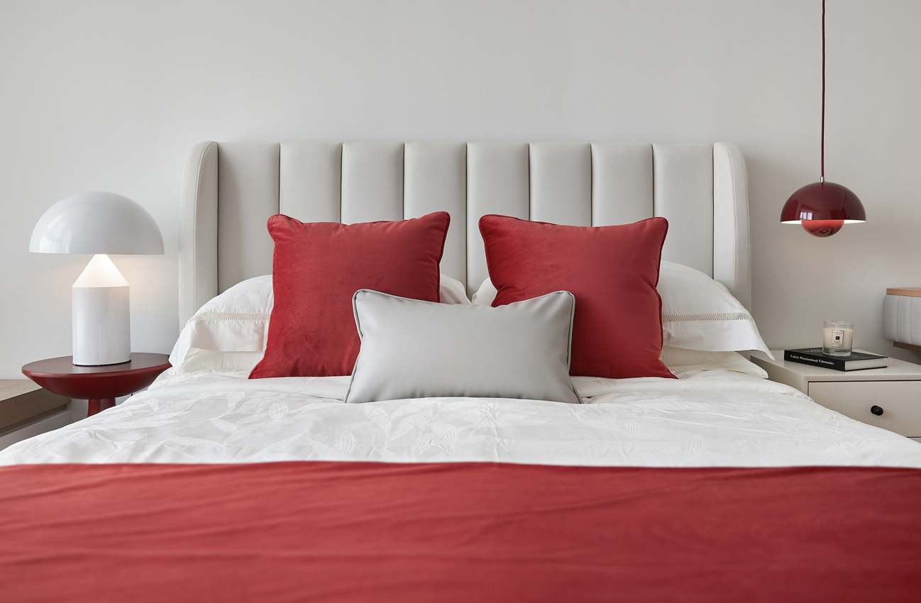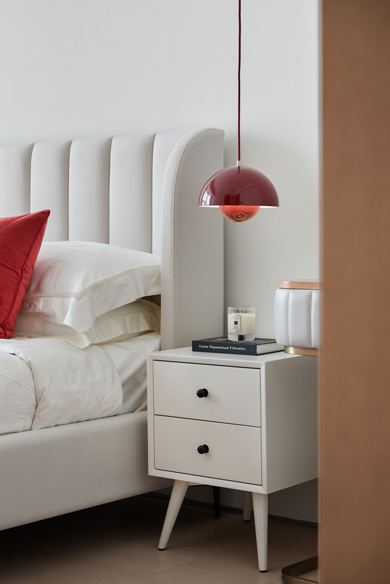 從審美品位到材質(zhì)把控、風(fēng)格定位的選擇上,設(shè)計(jì)師徐靜始終在不斷探求更加美好的設(shè)計(jì)呈現(xiàn)。光影隨意灑落于床邊,與精心調(diào)配的典雅藍(lán)和復(fù)古紅搭配出簡(jiǎn)寧質(zhì)感。適度留白給予居者更多的想象,在未來的日子里,用愛與品位去慢慢填滿。