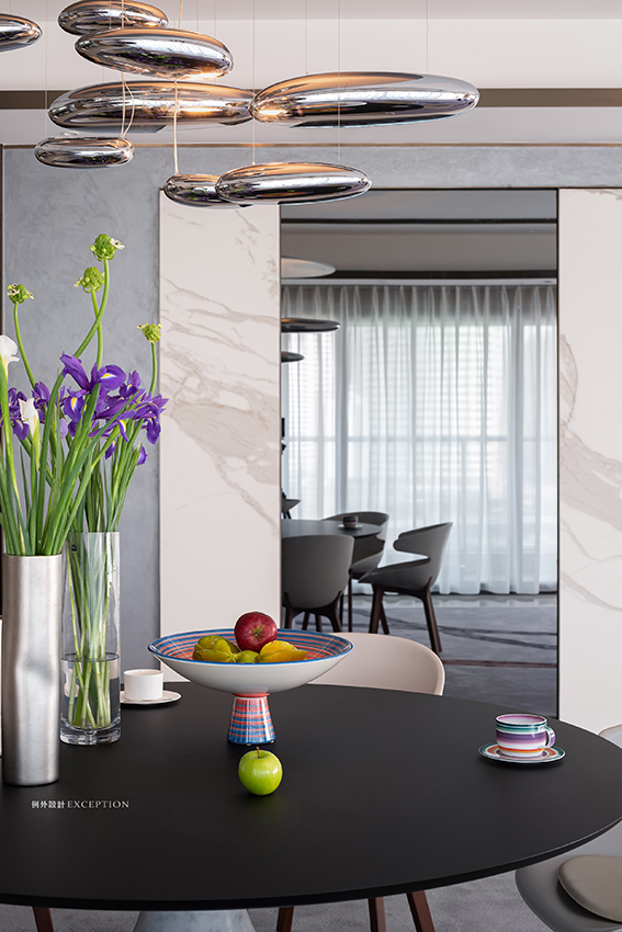 空間是有溫度和氣質(zhì)的,如同旅途的風(fēng)景,需要你親自抵達,細細領(lǐng)會。reine紫色太陽花落地?zé)粼诓蛷d一角營造出柔和的光影,紫色的花枝被陽光輕撫,在銀色游魚燈影下悠閑搖曳,六人位餐桌期待著川湘魯粵的各色風(fēng)味,食物的香氣縈繞鼻尖,芳香因子在井然有序的空間里得到最大化釋放,正如設(shè)計師徐靜所說:幸福往往就藏在這平常的煙火氣里。
