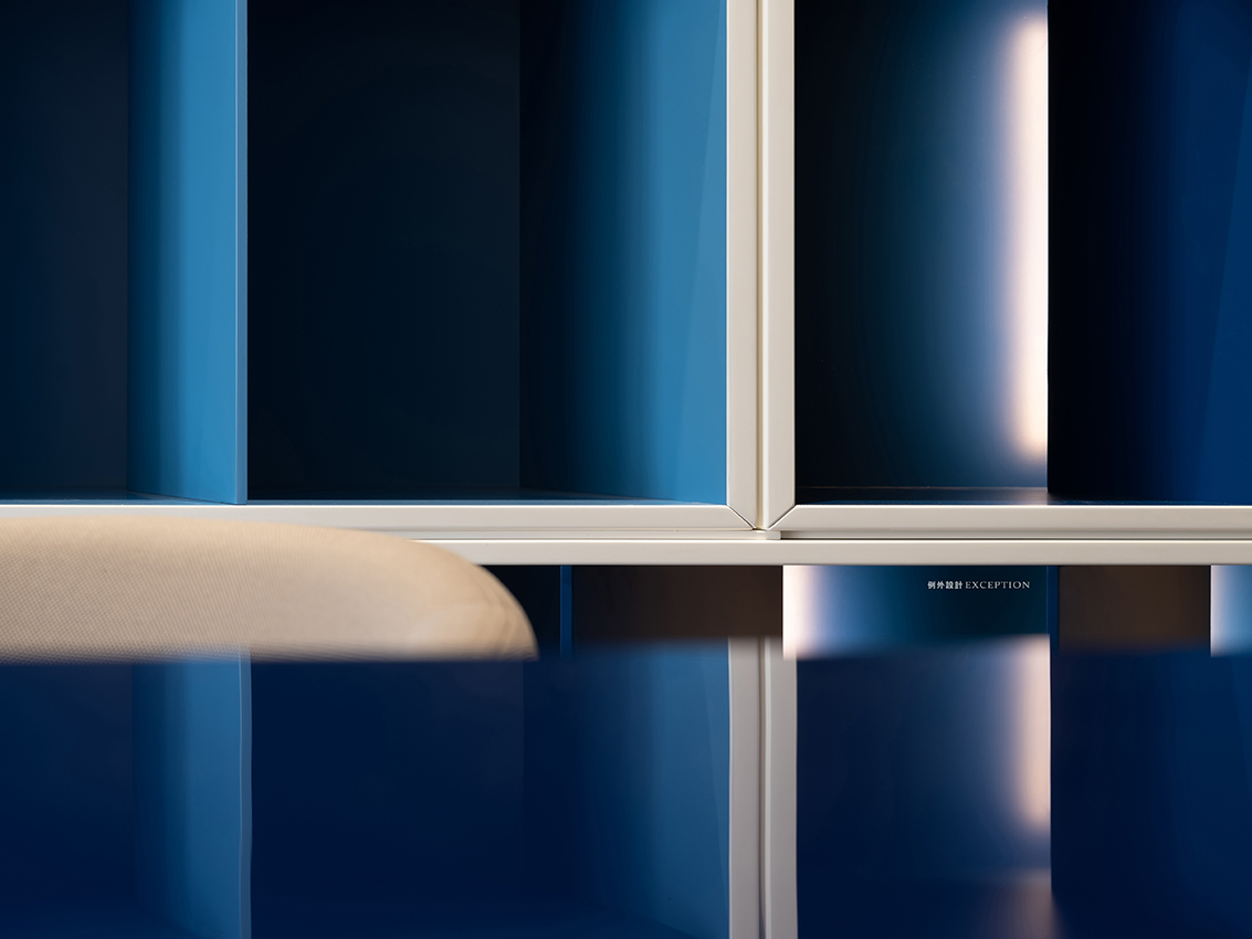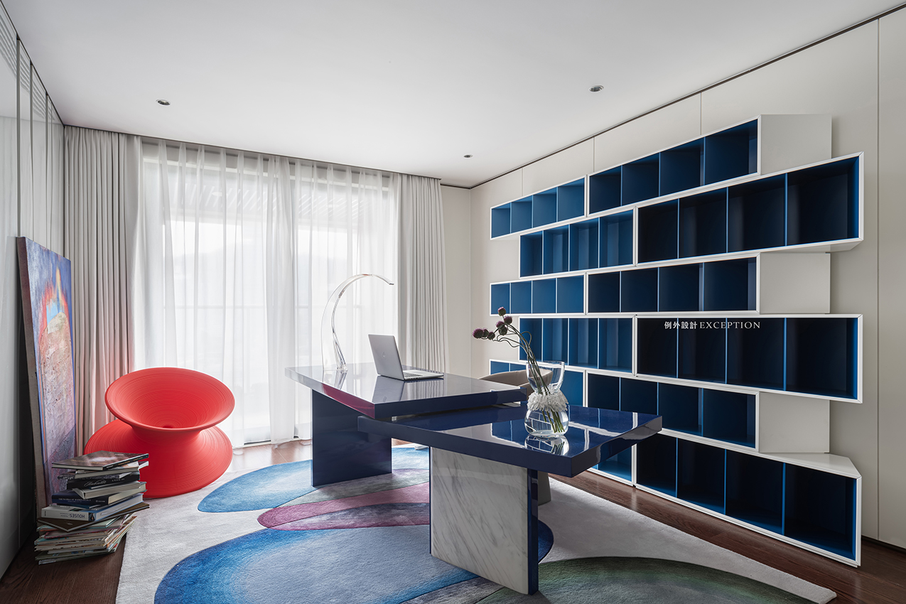 推開門,清風(fēng)和陽光悄悄溜進來,不同層次的藍色在光影中融合、交疊,有大海的深邃,亦或是天空的晴朗,編織成一派自然隨性的清爽。建筑體塊構(gòu)成的寶藍色造型書桌,以合適的角度容納雙人辦公、小孩互動的場景??词澜绲慕嵌葘α?, 哪里都是風(fēng)景。