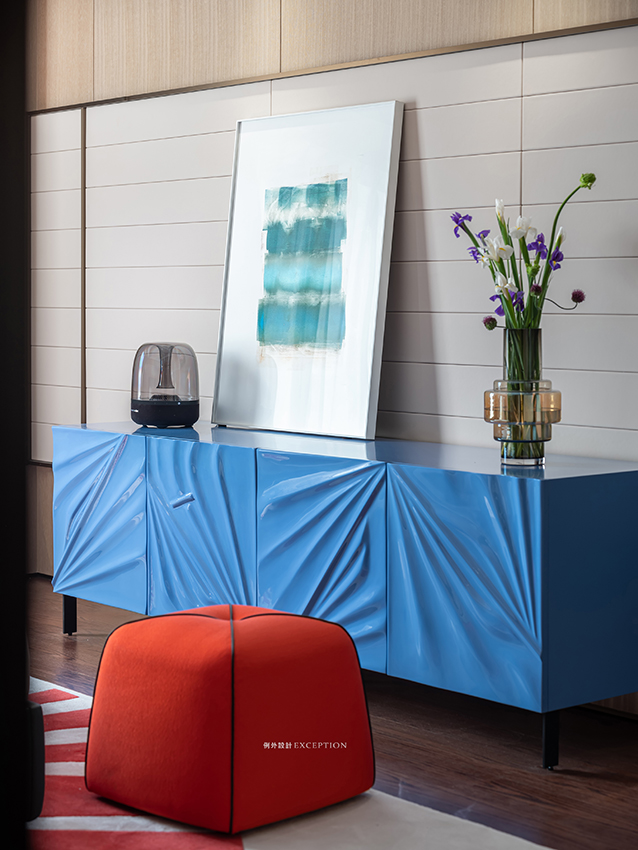 層次分明的藍像一根線,串聯(lián)起居者日常里有關(guān)美、有關(guān)格調(diào)、有關(guān)體驗的故事,如珍珠般在歲月的流淌中耀眼奪目。在光影游戲中,靜下心來你會發(fā)現(xiàn)那些貝殼紋理的柜體、抽象簡潔的掛畫以及如花朵盛放的地毯,就是一種充滿藝術(shù)與韻律的組合,在不同的時分去觀看,都有笑意和溫暖從眼中跑出來。