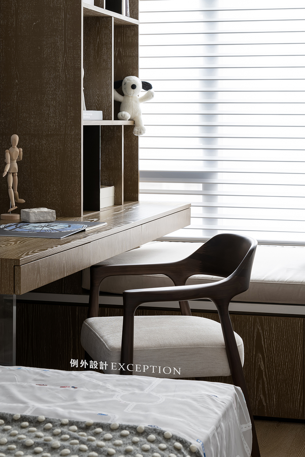 主臥空間以極具包容的大地色系敘述著空間的溫柔靜美,自然的光影輕歌曼舞,設(shè)計(jì)悄無聲息地營(yíng)造著生活的場(chǎng)景,窗臺(tái)邊賞景品茶,興起時(shí)伏案創(chuàng)作,在專屬的空間,發(fā)掘生活的趣味與溫情。
