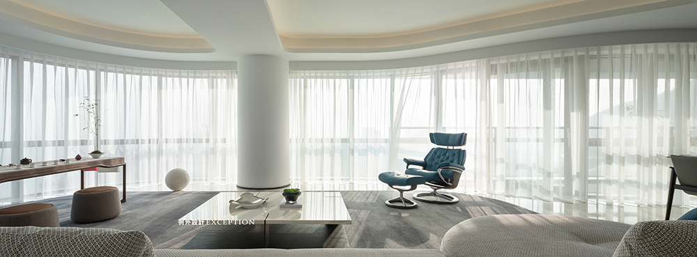 客廳弧形落地窗將巨幅海景納入室內(nèi),視線所及都是清爽明亮的美好。陽光透露出的暖意讓人全身心得到放松。眼前是傾囊相授的海景,心中是歲月恬淡的自足。