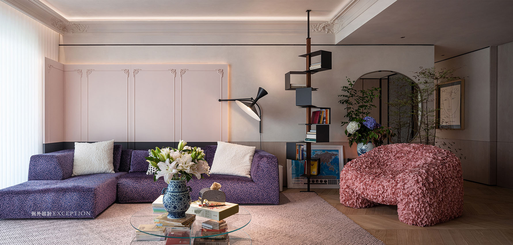 在這個家的設計過程中,設計師鄭鴻把控整體格局,關鍵詞是:簡約有質感??蛷d的硬裝盡量做到簡潔,天花四周點綴了設計師徐靜喜歡的雕花,搭配肌理感的藝術涂料,干凈又有細節(jié),所以設計的重點更多是放在靈活的軟裝上?!按笞匀豢偸悄軒Ыo我靈感,紫羅蘭優(yōu)雅高貴,隨處可見的綠葉植物活力盎然,櫻花粉浪漫清新……所以我把瑰麗的自然色彩帶回了家?!毙祆o說道。