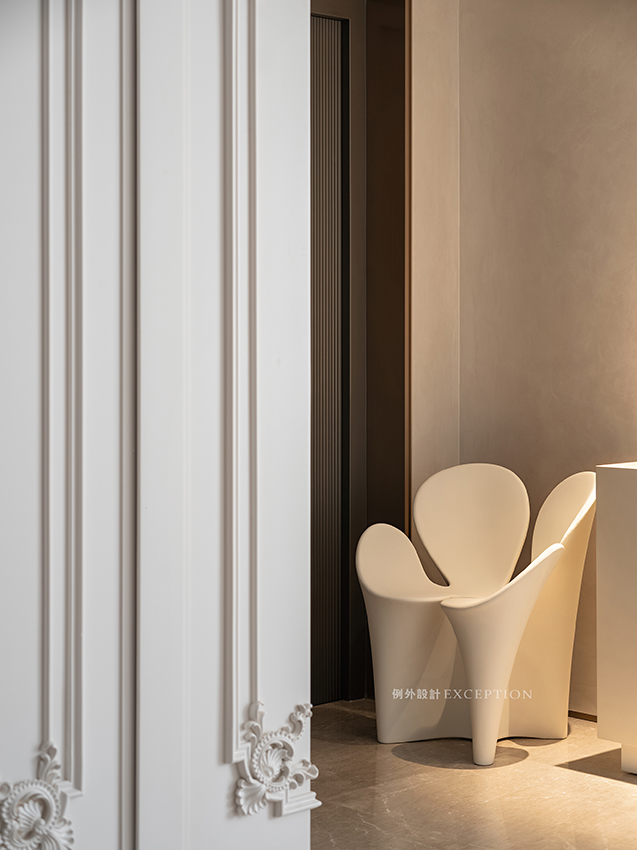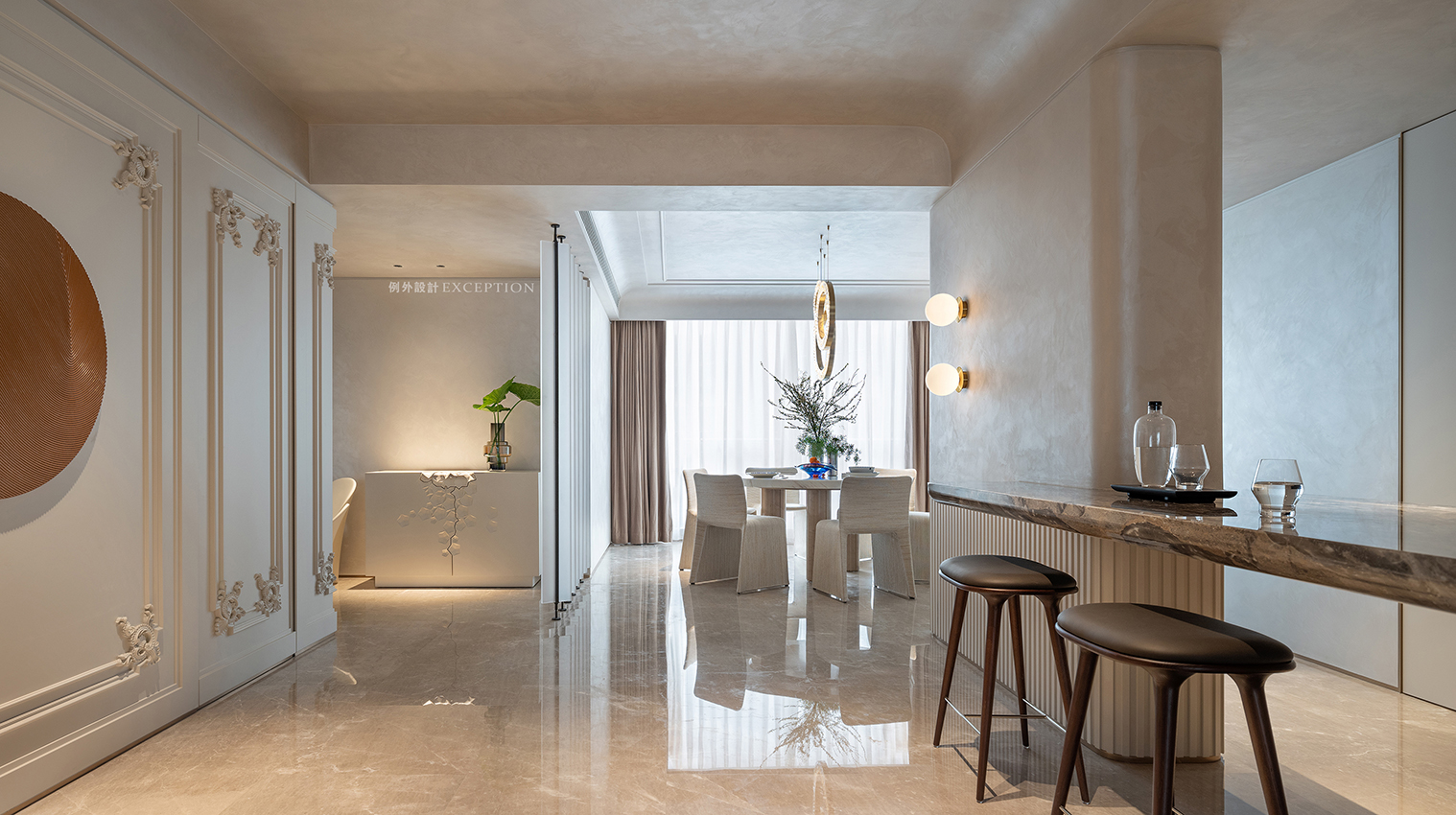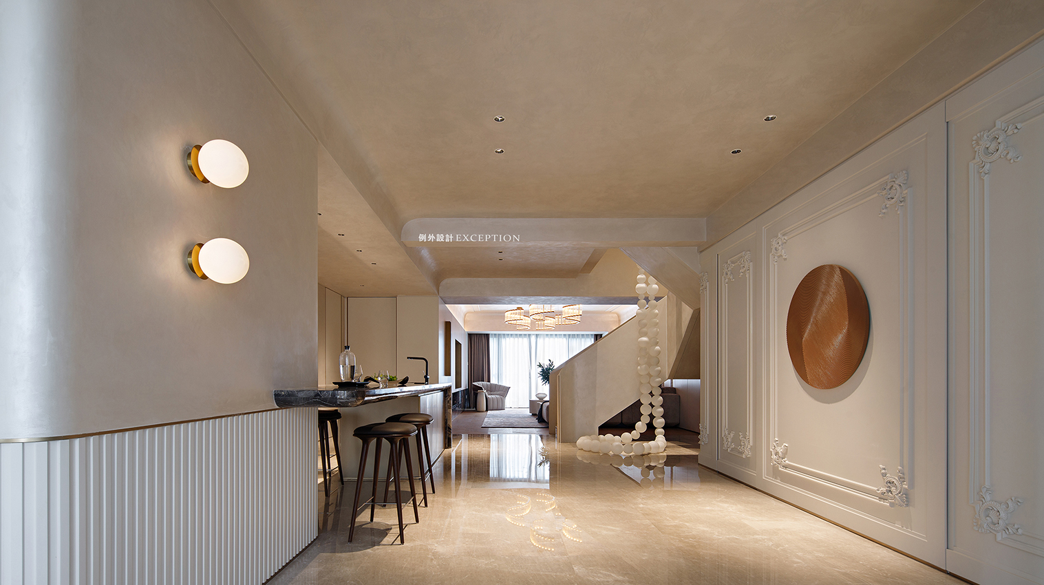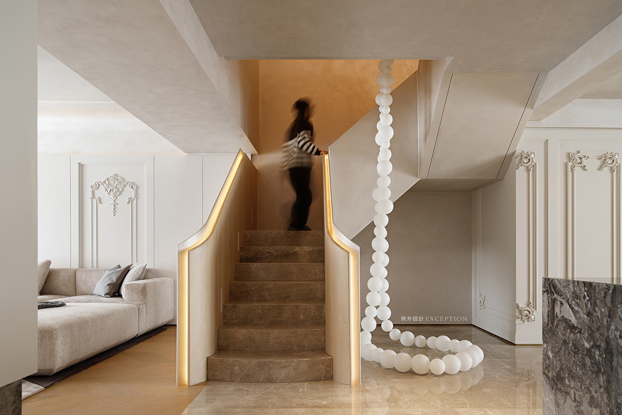 隨著視線的上移,白色串珠裝飾如同珍珠項(xiàng)鏈指引著新的空間視角,承啟上下空間的優(yōu)雅敘事。