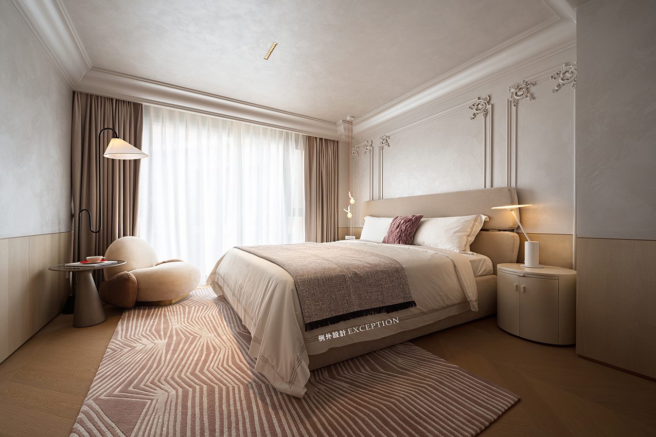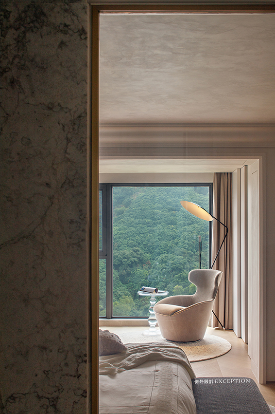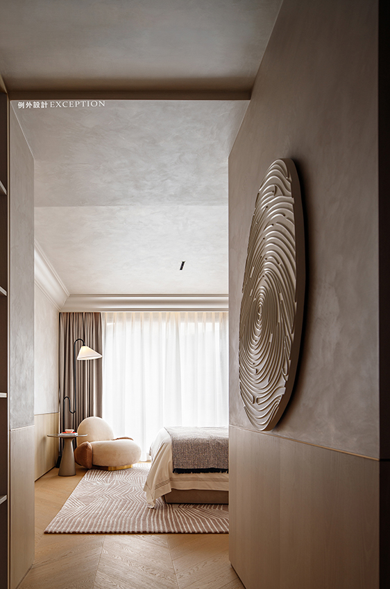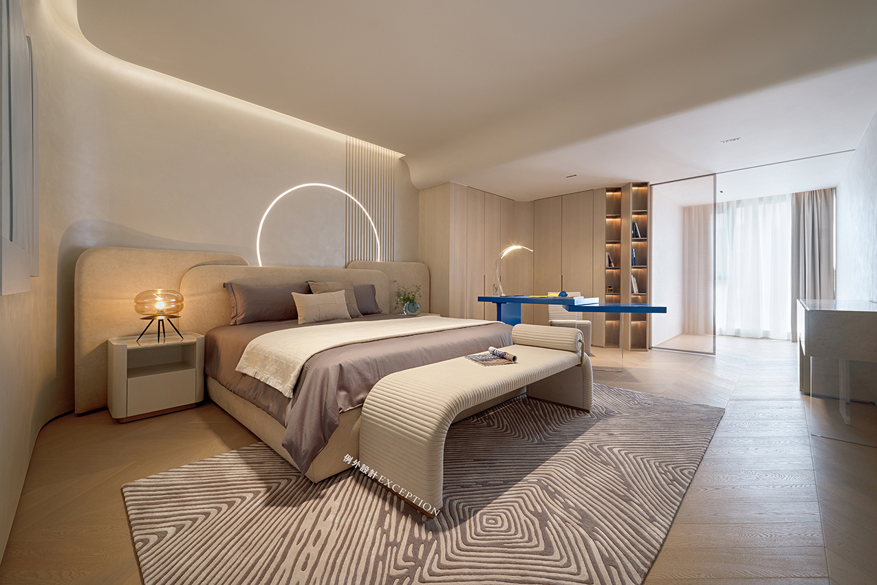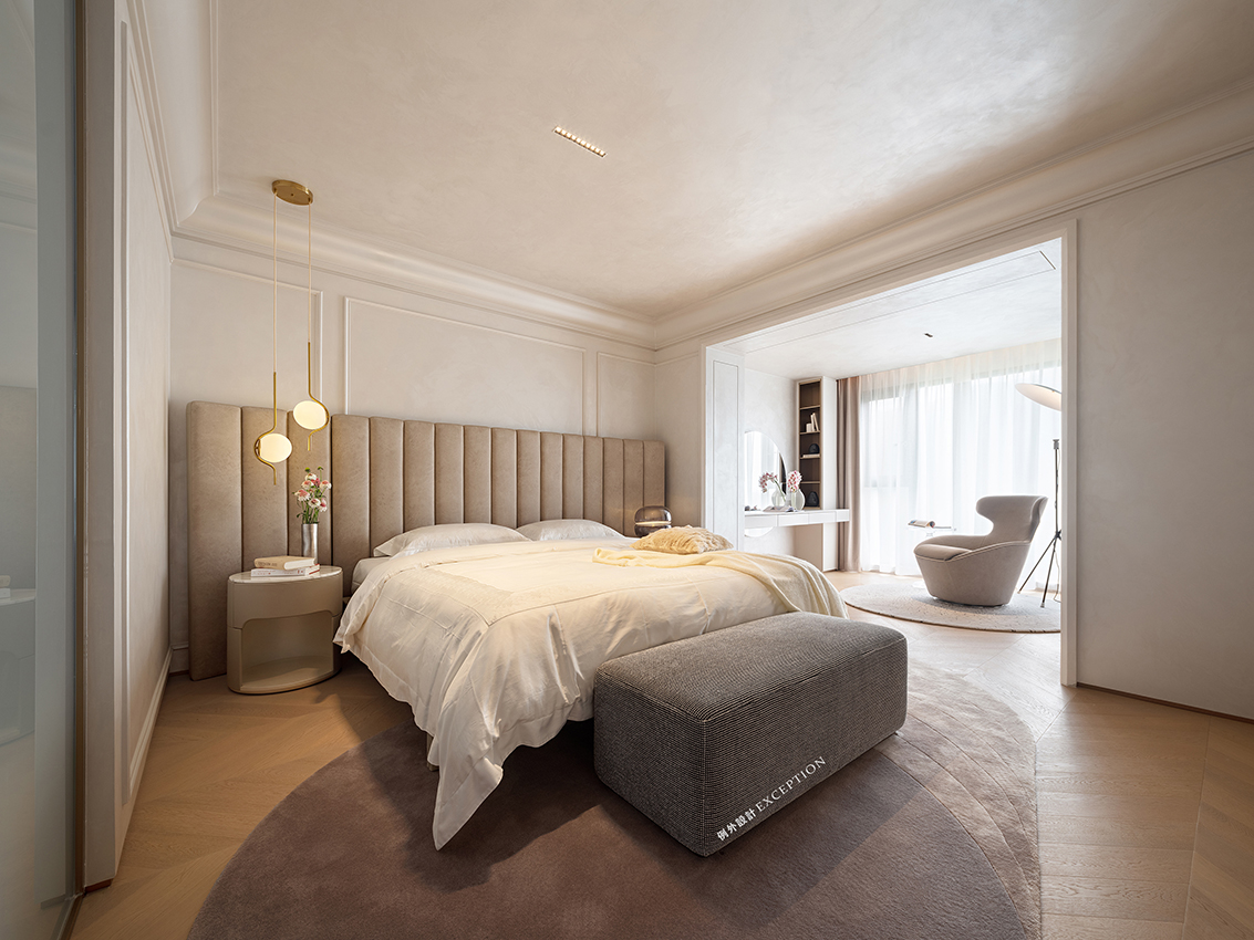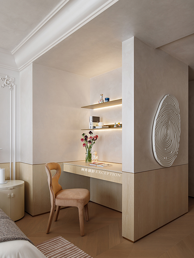 女主人的臥室依舊延續(xù)整體優(yōu)雅富有包容性的奶油色,每一處細(xì)節(jié)不爭不搶,陽臺納入室內(nèi)增加了舒適的尺度,線條和體塊的相遇,各自美麗卻又彼此契合。墻背后特意設(shè)計了暗藏的步入式衣帽間,梳妝區(qū)以不一樣的視角納入恰到好處的光線,映照出居者專屬的氣質(zhì)和品位。