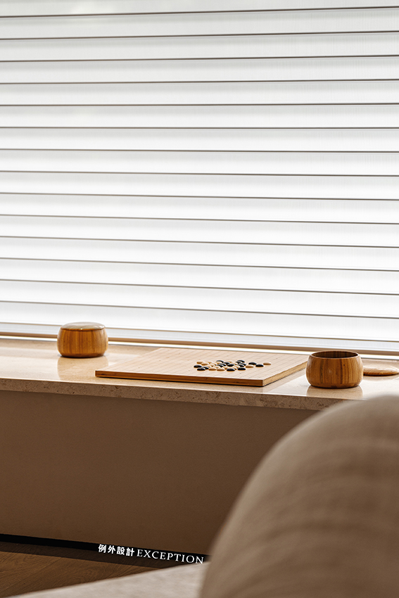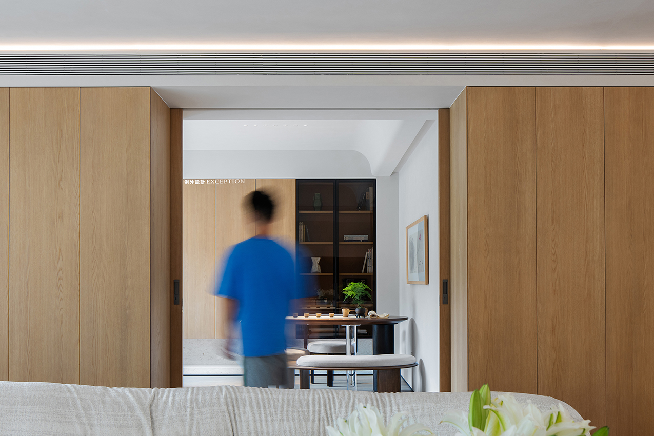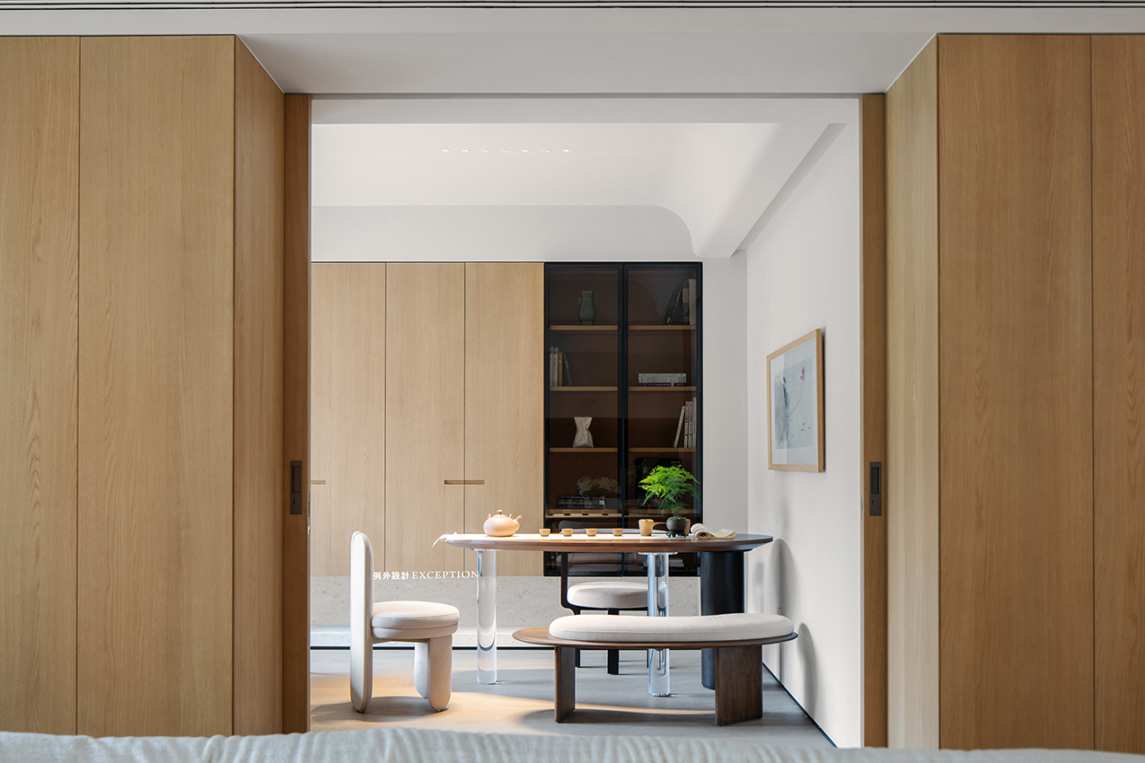 打開(kāi)推拉門(mén),多功能房便向我們展示出不同的生活場(chǎng)景。茶席鋪開(kāi),汲水烹茶,時(shí)間在茶味的啜飲中慢慢沉淀,越品越香醇。當(dāng)家里有客人需要留宿的時(shí)候,下翻床可以充當(dāng)客房使用,原木的儲(chǔ)物柜,窗外枝葉婆娑的綠影,讓人與自然更加貼近。