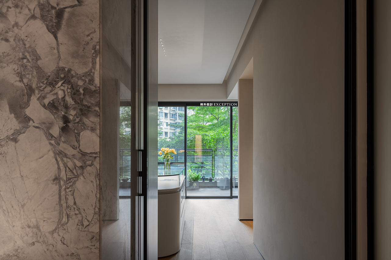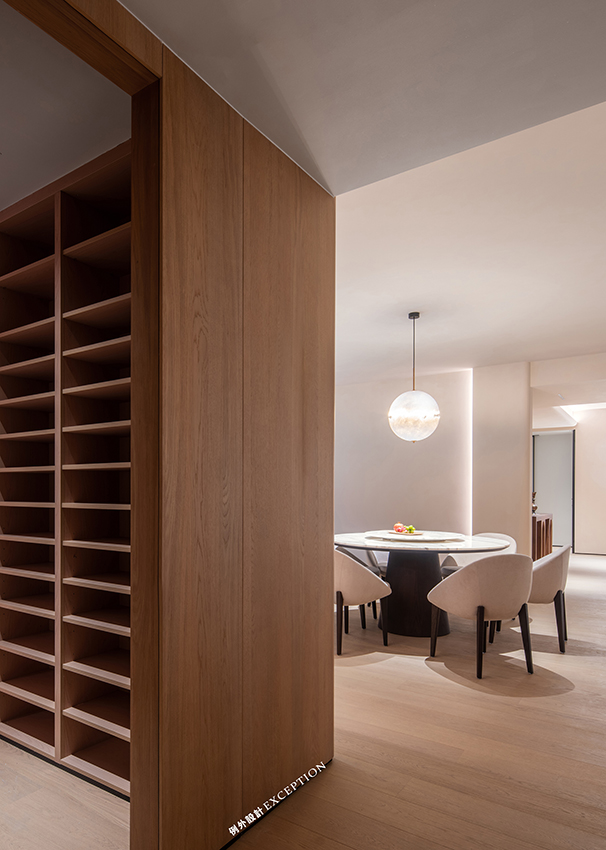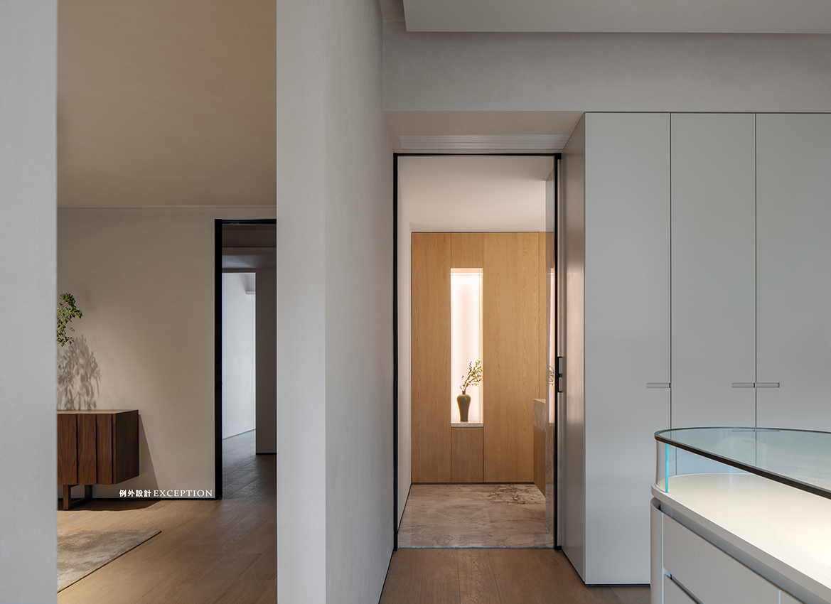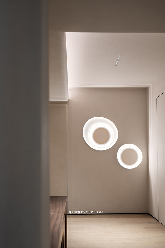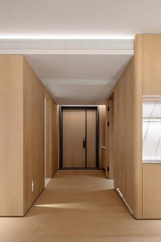 過(guò)道敞闊如斯,溫潤(rùn)而自然的木作與肌理感的藝術(shù)涂料宛如天然生長(zhǎng),亮起的壁燈如同星月指引,行走在其間,似穿行于原野,室內(nèi)室外在視覺(jué)上連為一體。