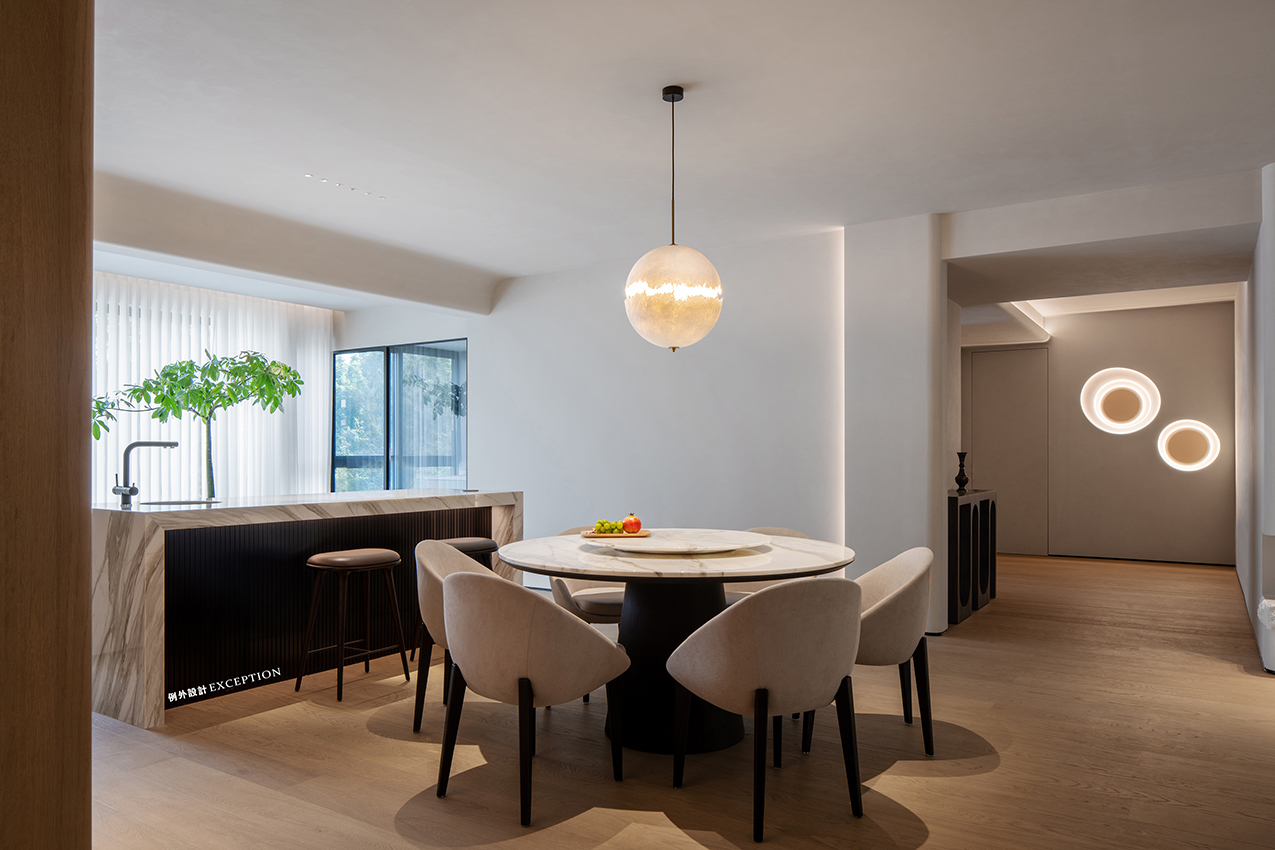 空間最好的狀態(tài)就是隨性舒適,通透自由。開(kāi)放式的餐廚區(qū)與客廳隔而未隔,也是一家人最舒服的互動(dòng)場(chǎng)所。制作美食的同時(shí)也能兼顧孩子的動(dòng)向,溫暖的情感在這里流動(dòng)蔓延。