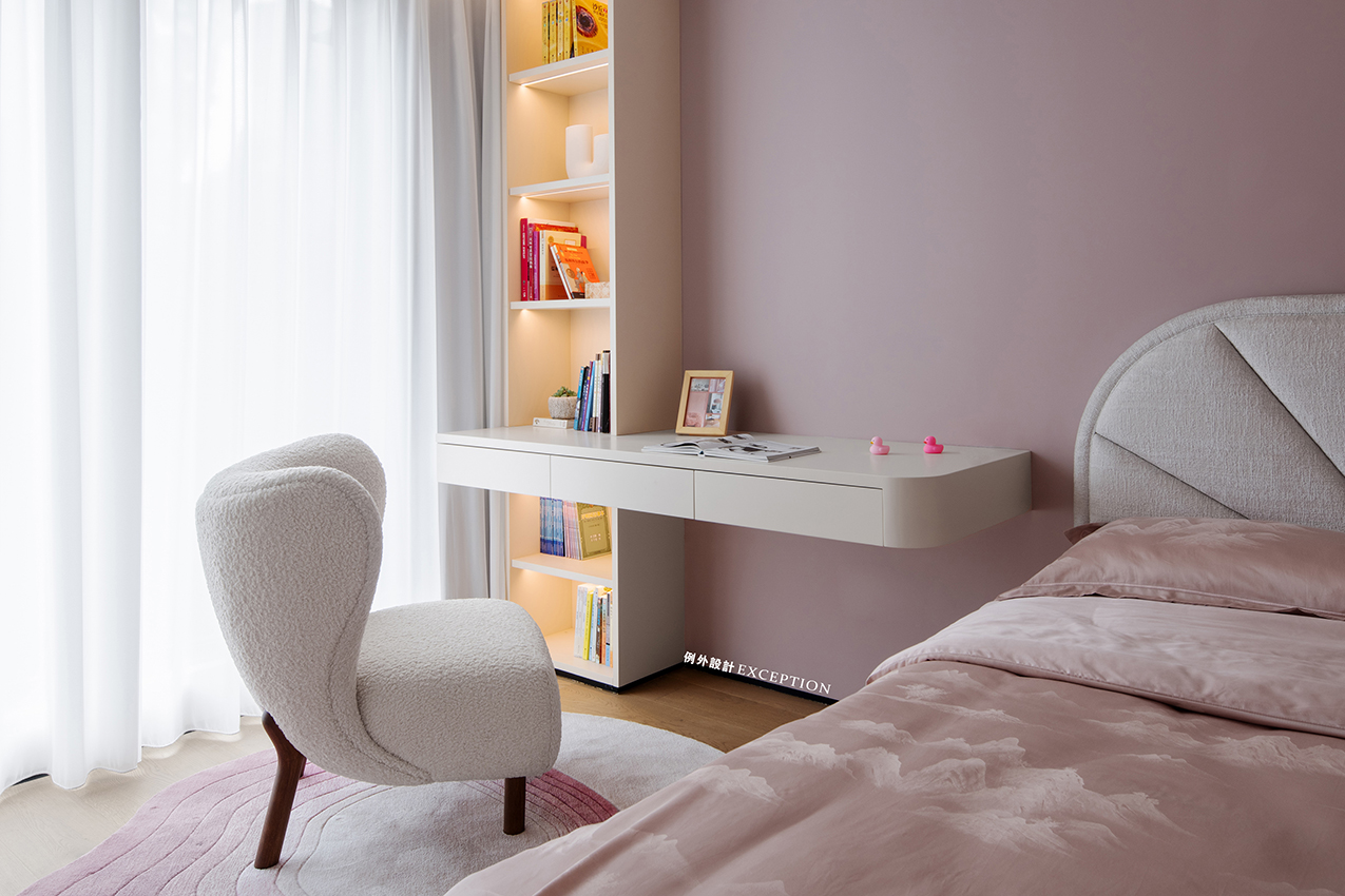 女兒房窗外的自然景致擴(kuò)展了對(duì)美好的觸達(dá),在一片粉色的擁抱里,起居有了具象的闡釋。比例造型精巧適宜的家具,守護(hù)著甜美童真的夢(mèng)。如同綺麗多姿的花園,伴隨著孩子的成長(zhǎng)一同盛放。
