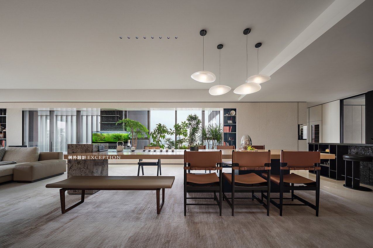 客餐廳一體打通,形成視覺上的延伸感,家人的生活動(dòng)線也更加清晰、流暢。餐桌加茶臺(tái)的組合設(shè)計(jì)使餐廳功能得到了延伸,家人就餐以及日常社交都可以在此進(jìn)行。面向盈盈綠意,心境也會(huì)更加開闊、明朗。