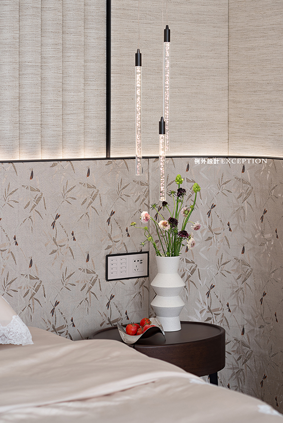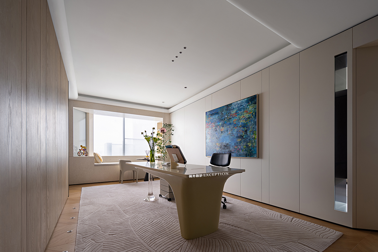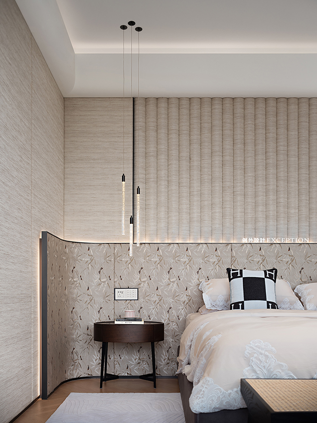 主臥三進(jìn)式的布局增加了生活的儀式感,考慮到男女屋主不同的起居時(shí)間,主臥、書房、衣帽間及主衛(wèi)之間通過推拉門產(chǎn)生鏈接,即使男屋主應(yīng)酬晚歸時(shí),也不會(huì)影響愛人的睡眠。另外多動(dòng)線的設(shè)計(jì)讓屋主在衣帽間穿搭完畢后,無需返回主臥,便可快速出門。