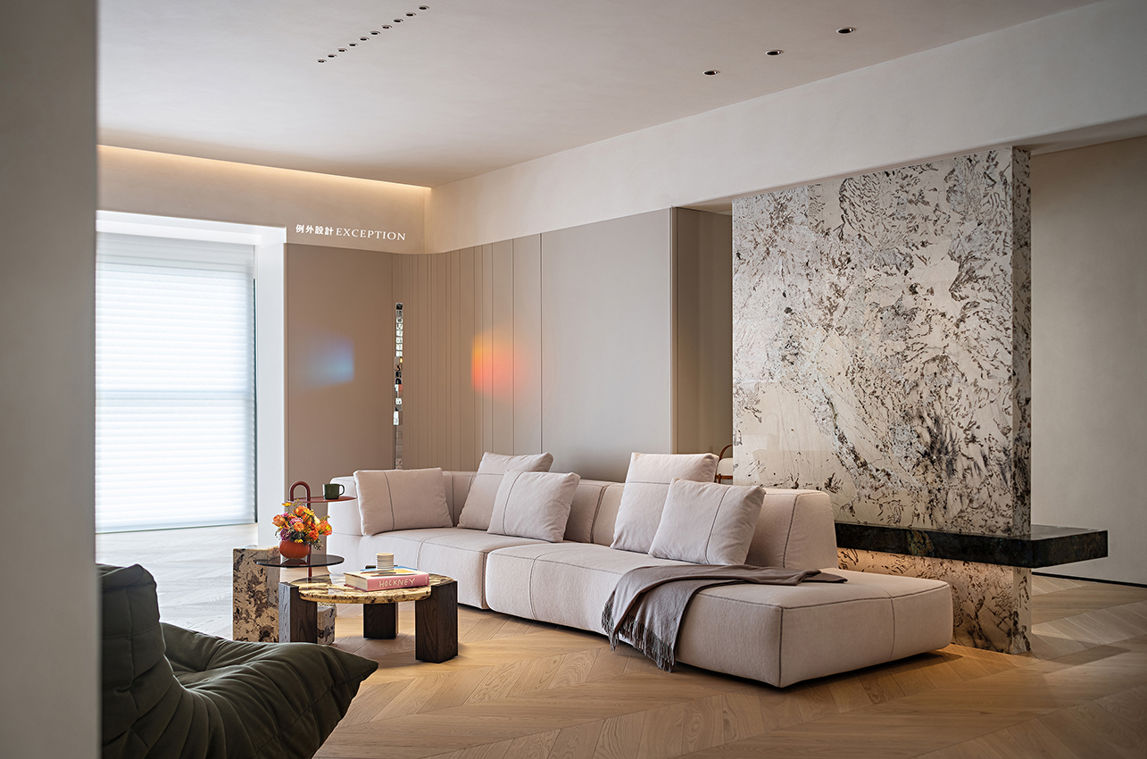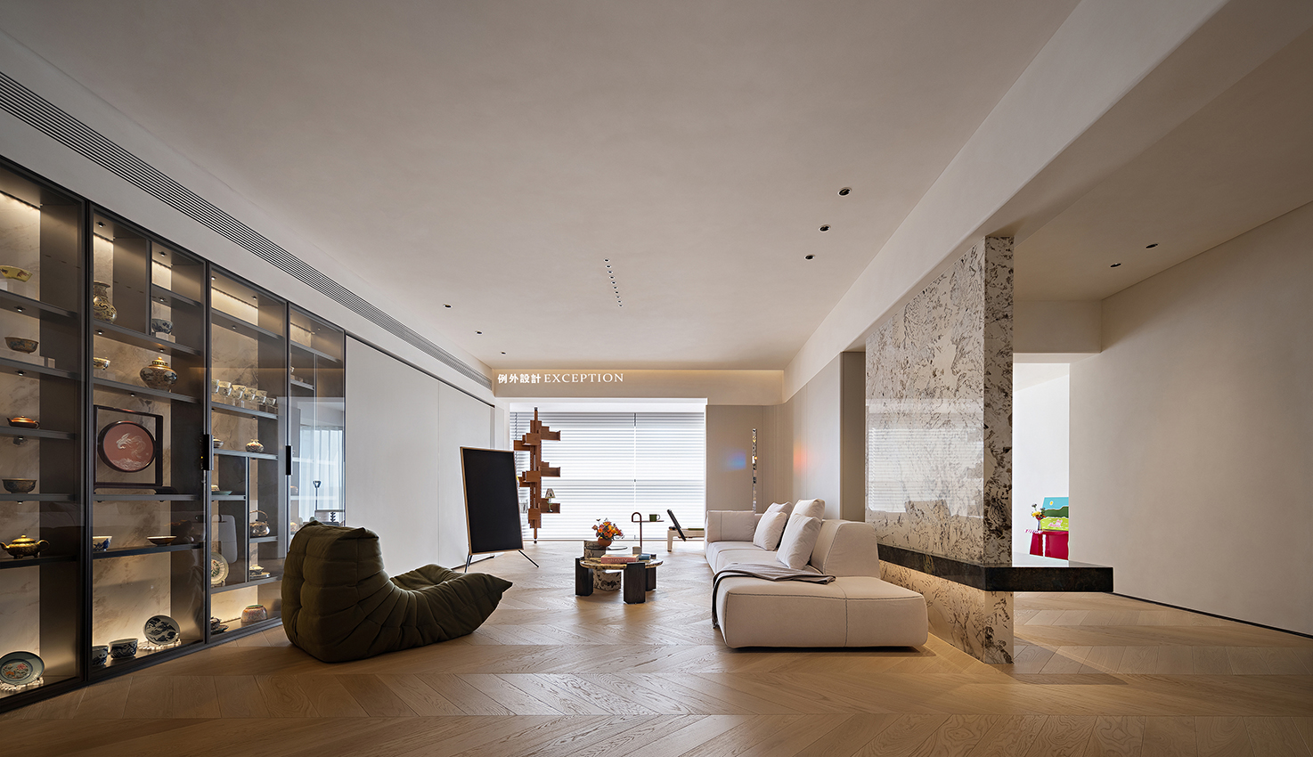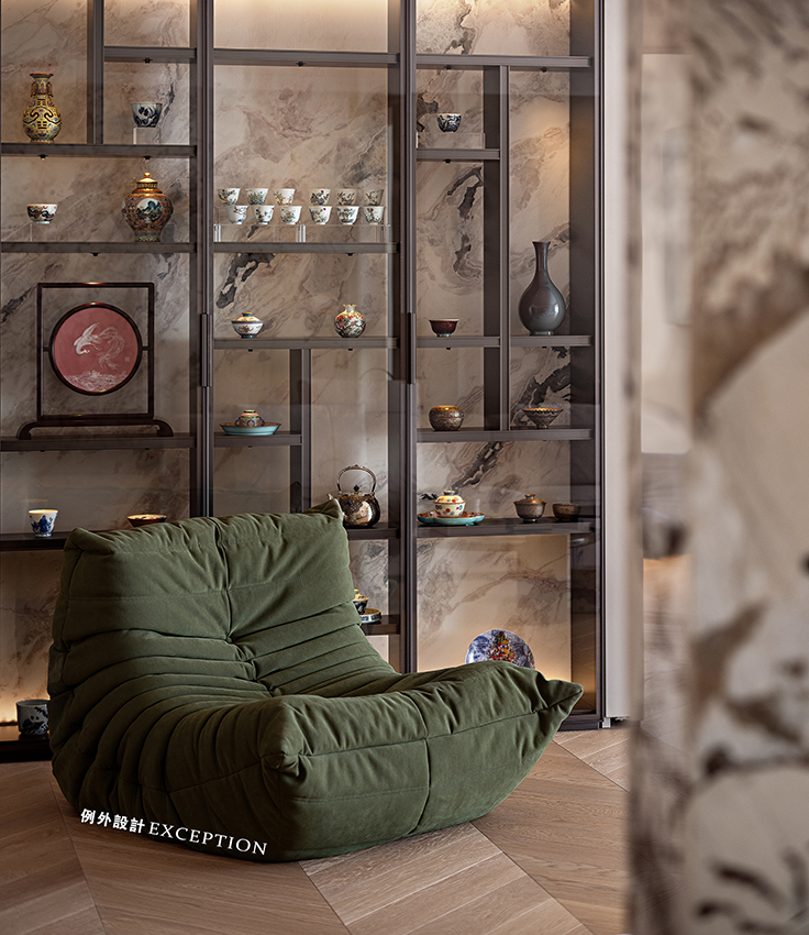 推開門眼前是一道大理石背景隔斷,流動(dòng)的紋理匯聚成鳳凰高飛的模樣?!对娊?jīng)》有言:“鳳凰于飛,翙翙其羽,亦集爰止?!贝罄硎尘俺尸F(xiàn)了更豐富的層次,也增添了家庭和睦的美好寓意。一旁的taschen經(jīng)典畫冊在隨手翻閱間,有美和藝術(shù)在黯然流動(dòng)。