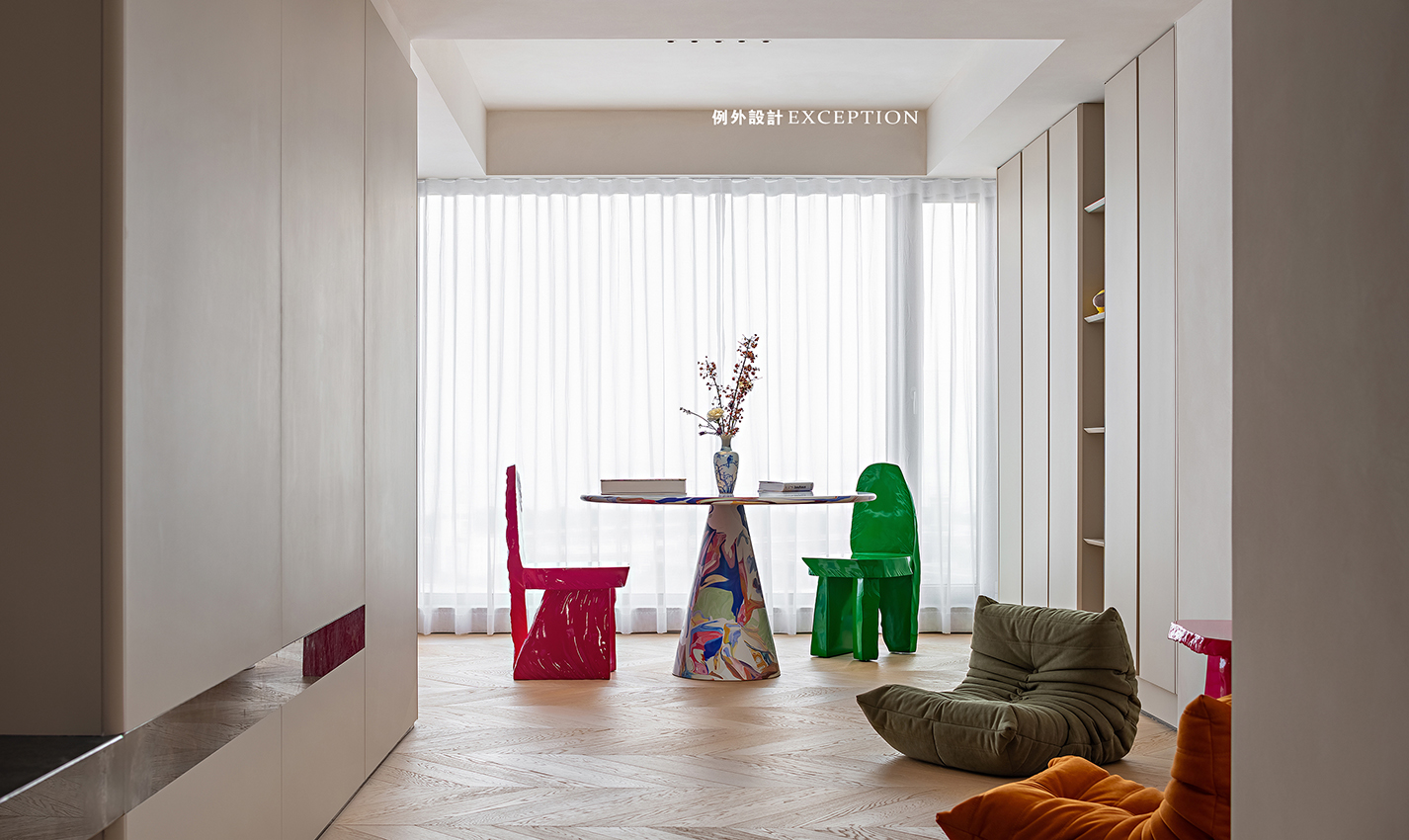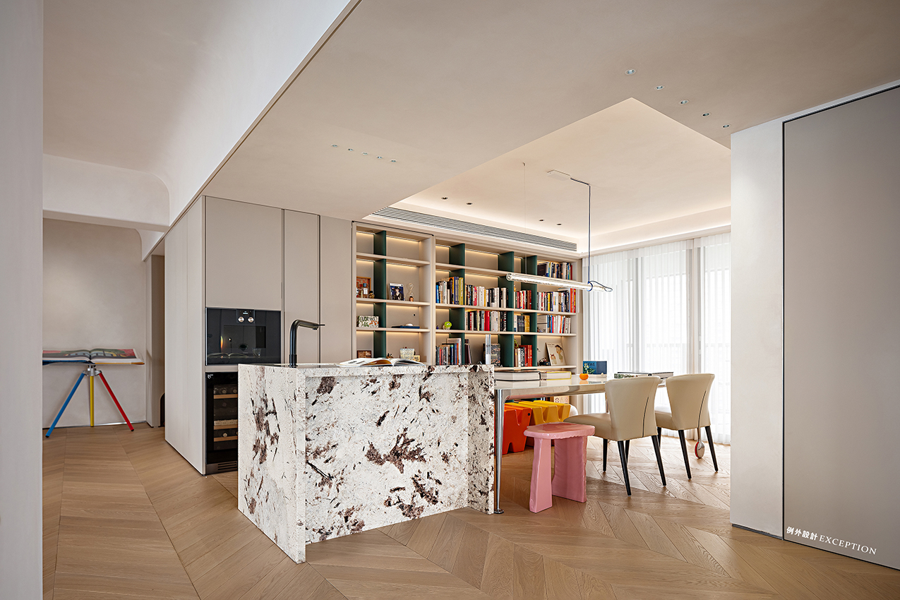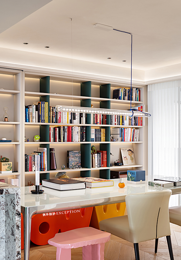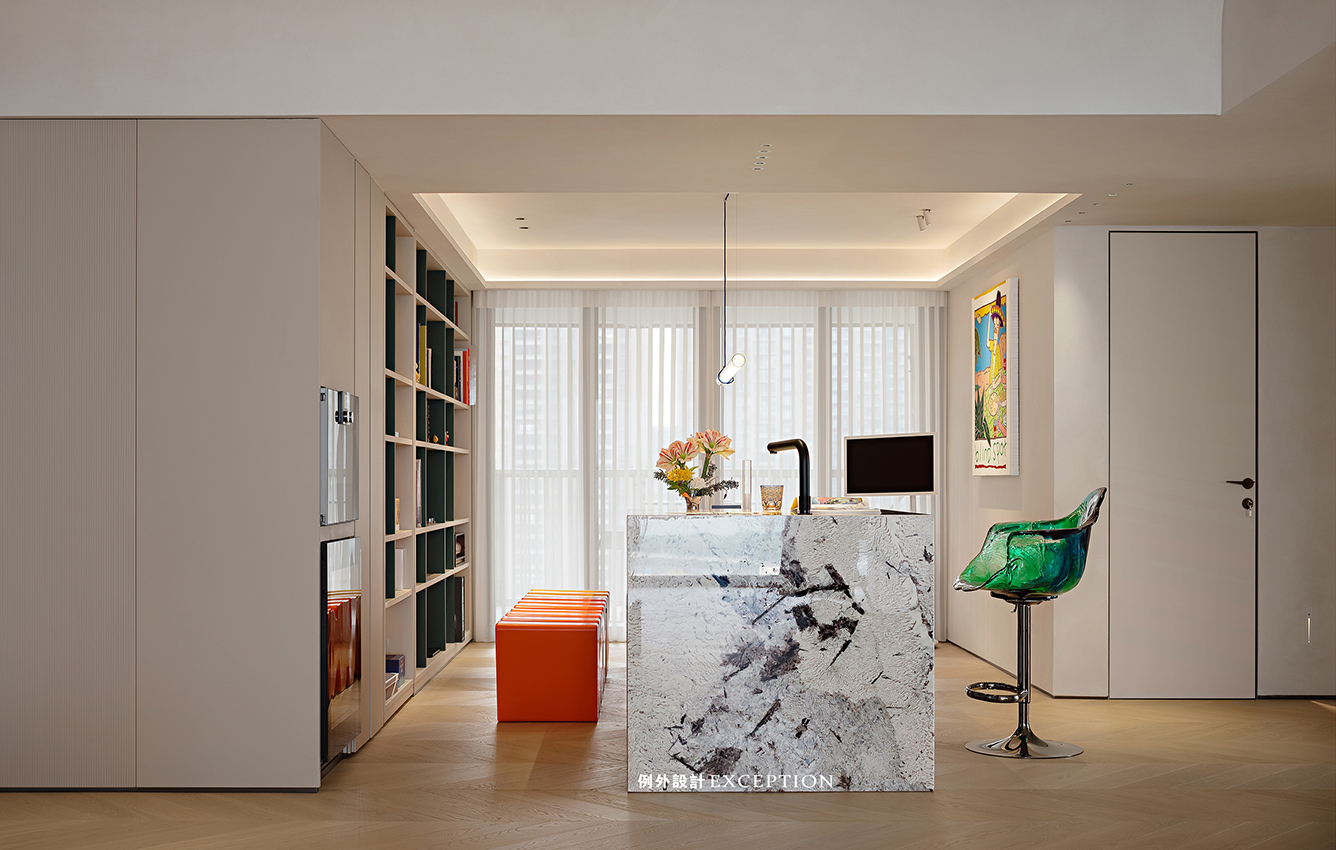 吧臺(tái)是屋主待得最多的地方,在這邊專注地辦公或是看看紀(jì)錄片,看看書,都是高質(zhì)量的獨(dú)處時(shí)光。在硬裝上鴻藝源設(shè)計(jì)給予了空間無限的留白,讓屋主可以在軟裝上投射自己的品位與喜好。明亮的色彩增加了空間的靈動(dòng)氣息,edra綠色花瓣椅如同大地的呼吸,在一起一伏間,躍動(dòng)著生命的力量。