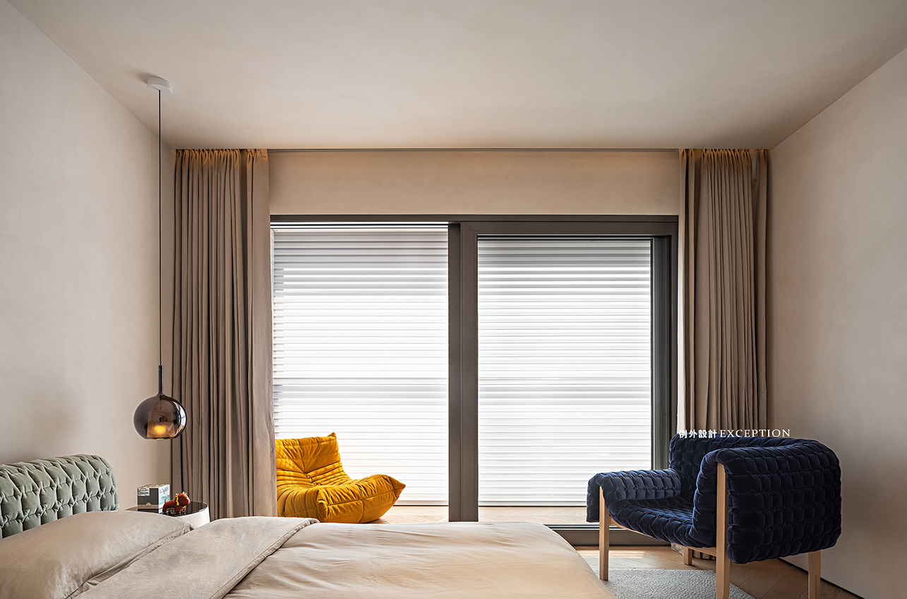 主臥淡雅的蒼葭色床成為了空間的主導(dǎo),搭配著漸變綠的藝術(shù)吊燈,頗有一番恬靜的意趣。窗外的自然光線會(huì)如期光臨,陽臺(tái)上的綠植也會(huì)隨風(fēng)搖曳,一切被悉心關(guān)照的細(xì)節(jié)為室內(nèi)增添了幾分輕盈的呼吸感。