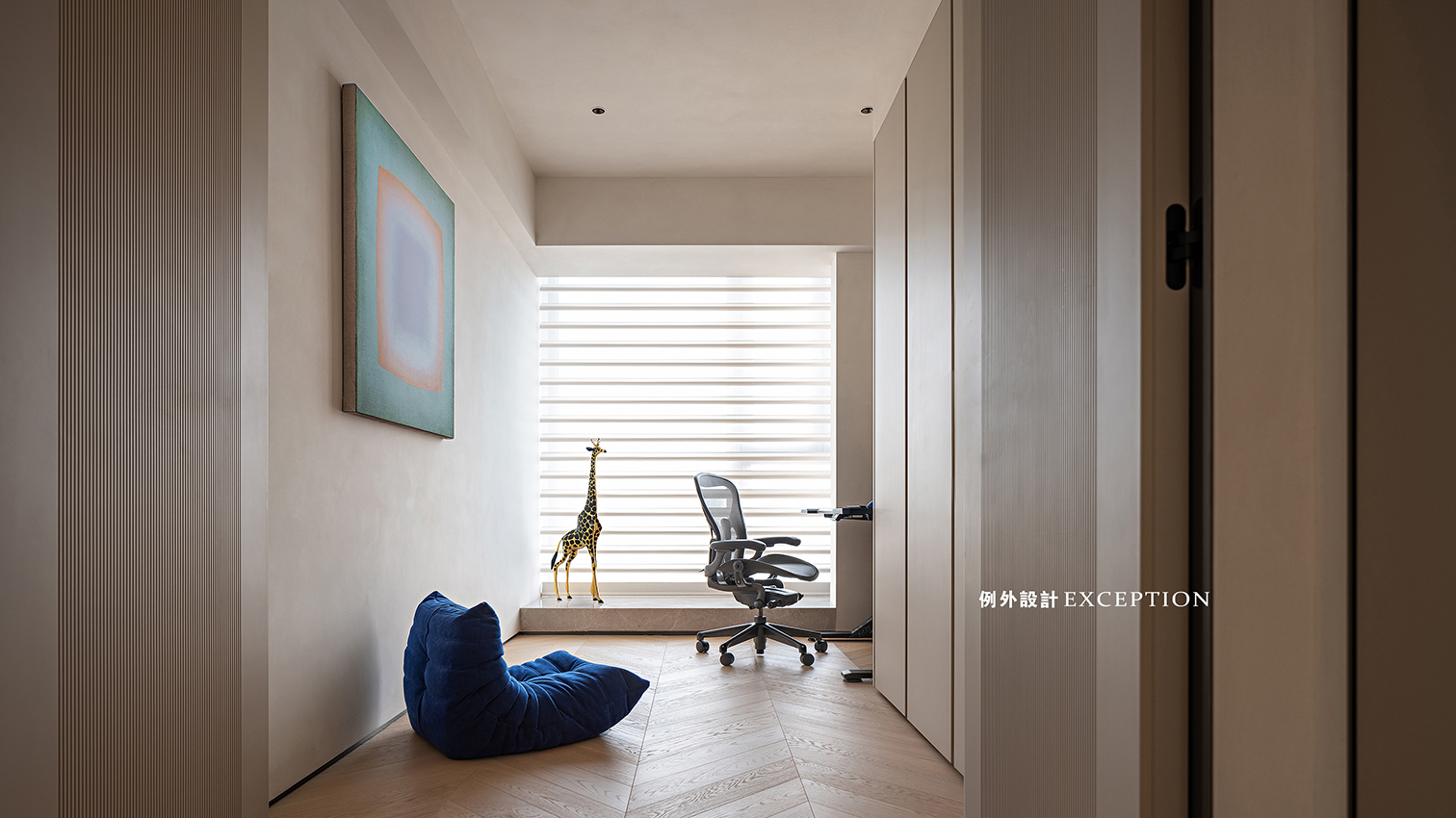 書房是使用頻率較高的空間,畫家陳若冰的作品掛在最顯眼的入口,這是屋主非常欣賞的作品。陳若冰的畫作能夠帶領(lǐng)觀者進(jìn)入一種療愈的精神狀態(tài),每次從這里經(jīng)過時(shí),她總能感受一種平和、安靜的力量。