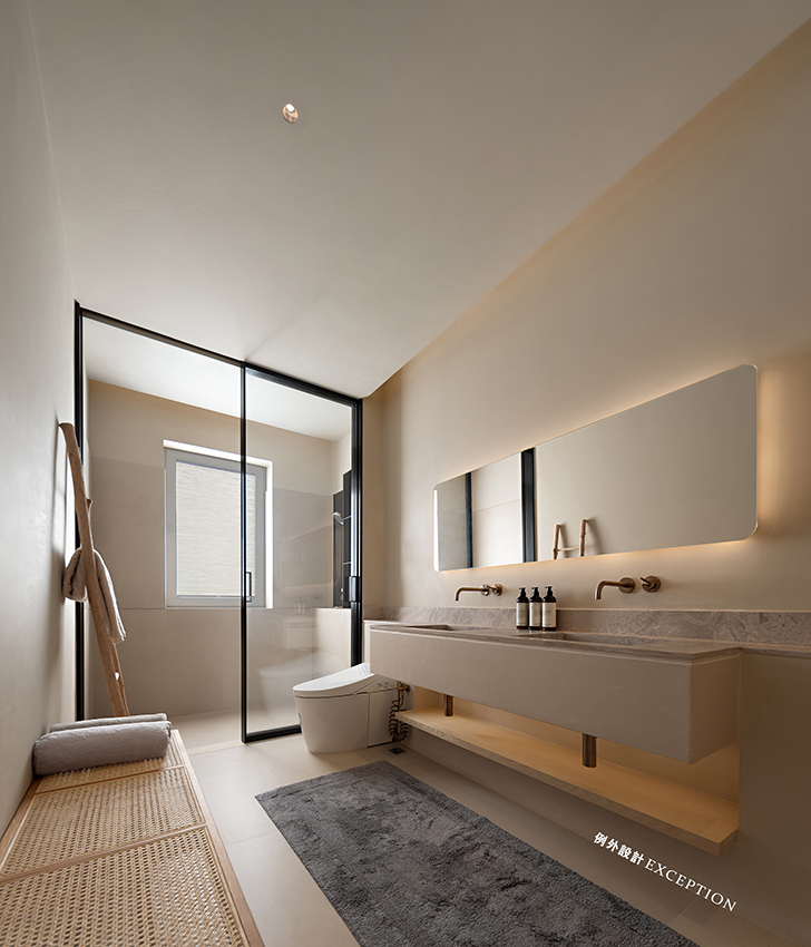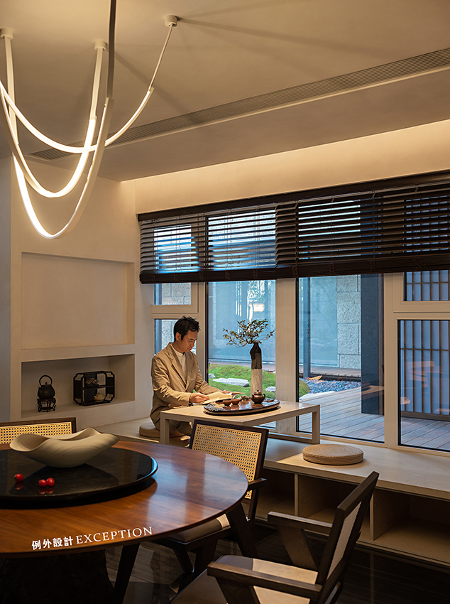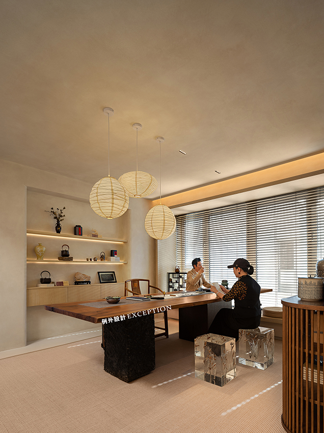 鴻藝源&例外設(shè)計(jì)以藝術(shù)涂料和實(shí)木材質(zhì)定下空間的硬裝基調(diào),柔和溫暖,包容性強(qiáng)。四時(shí)的園林景觀透過(guò)橫窗和格柵,將清雅和生機(jī)引入室內(nèi),讓心靈隨時(shí)都充盈著極致的閑適。