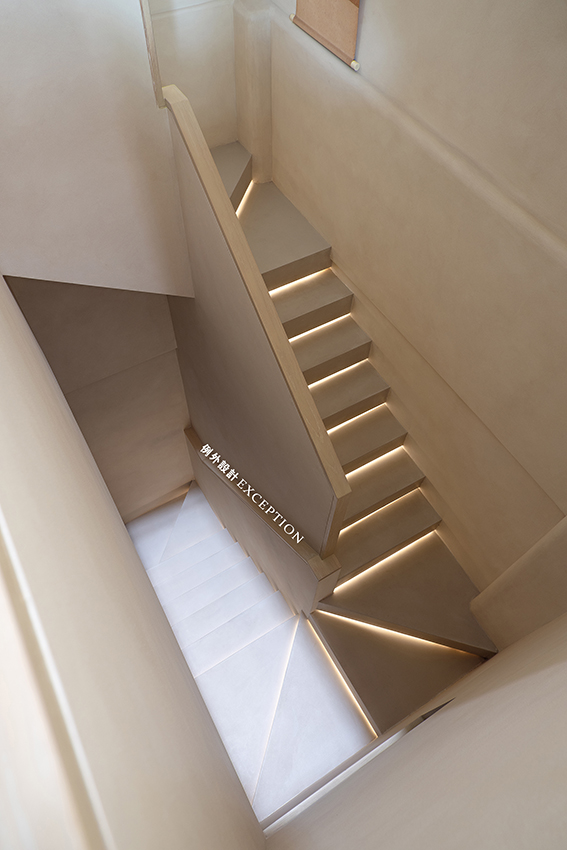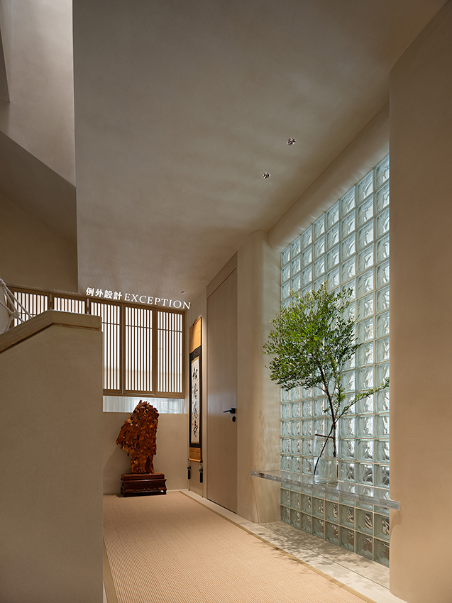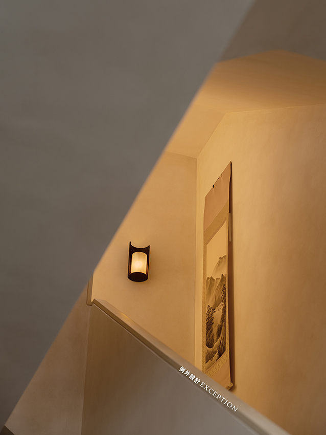 樓道是聯(lián)通不同風(fēng)景的橋梁,拾級(jí)而上,拐角處都有一幅屋主珍藏的畫(huà)作,勻凈的燈光渲染出樸拙高遠(yuǎn)的意蘊(yùn),視線稍作停留,也會(huì)獲得漫步山水之中的禪意享受。