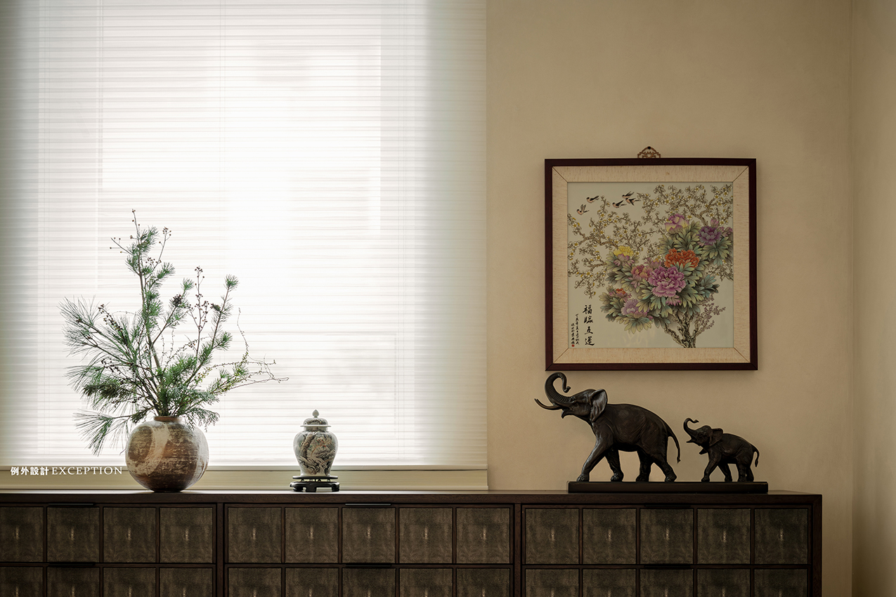 羅曼·羅蘭說(shuō):“藝術(shù)的偉大意義,基本上在于它能顯示人的真正感情、內(nèi)心生活的奧秘和熱情的世界?!痹O(shè)計(jì)師將原有的露臺(tái)改造成女主人的書(shū)房,鉑金茶墩與3.6米實(shí)木長(zhǎng)桌異常和諧,屋主會(huì)時(shí)常在這里喝茶、練習(xí)書(shū)法,文化的記憶與沉淀也在靜雅的環(huán)境中蔓延開(kāi)來(lái)。
