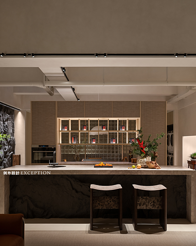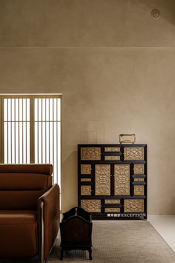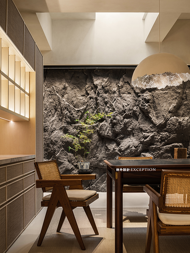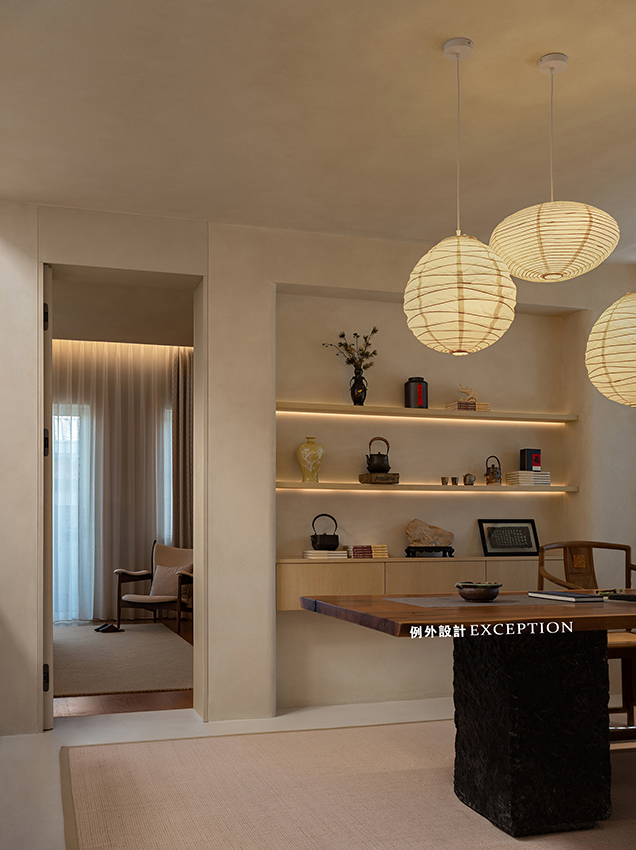 光線欠佳的地下室,設(shè)計(jì)師加入格柵窗和透光處理,引光入景,豐富了空間的層次。木質(zhì)、灰泥、天然石材和器物收藏,強(qiáng)化了靜謐古雅的語(yǔ)境,讓人處于其中,身心和洽,靈韻悠悠。