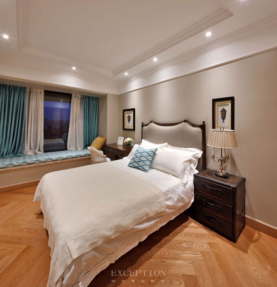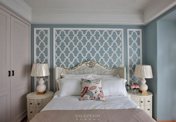 客臥色調(diào)采用了藍(lán)白相間的搭配,同樣的菱形花紋布藝讓靠包與飄窗軟墊形成呼應(yīng)之美,白色純凈,藍(lán)色深邃,摒棄冗余配飾,只留一份清凈予居者。