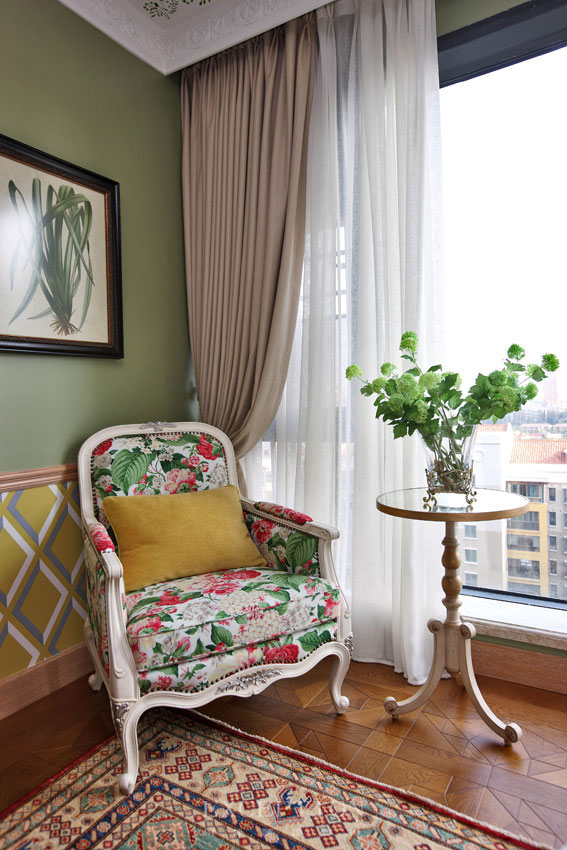一杯特調(diào)香草拿鐵氤氳著熱氣,升騰出一室的馨香,閑坐窗邊一隅,漫看窗外風(fēng)景,靜待午后陽(yáng)光透過(guò)紗簾漫進(jìn)室內(nèi),感受法式莊園獨(dú)有的浪漫恬靜。往往,替換布藝能為家具帶來(lái)耳目一新的裝飾效果,花葉主題的軟包似乎賦予這方洛可可風(fēng)格椅新生命,清麗的色調(diào)讓居者貼近自然,放松心緒。