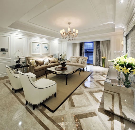 設計師以簡歐風格為主調(diào),配合后現(xiàn)代主義美式家私的新古典元素,拋棄多余繁冗的堆砌裝飾,極力還原一個簡白亮麗的純色空間,米色加白色以及少量黑灰色彰顯極簡主義的凌厲果敢與美學韻致,大量使用仿雪花白白大理石、玻璃馬賽克、白色仿皮革質(zhì)感的涂料等偏現(xiàn)代裝飾材質(zhì),符合時下現(xiàn)代人的審美視覺,目及手觸之處都是玲瓏一片純玉白。