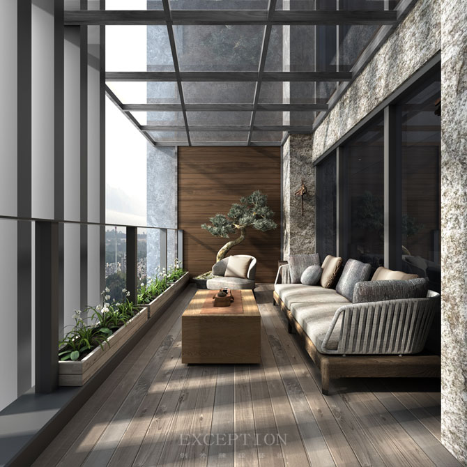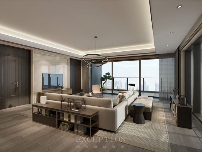 米咖的主調(diào)下,凜直干練的線(xiàn)條游走在邊幾、柜沿上,中式的風(fēng)姿立現(xiàn)。松風(fēng)燦陽(yáng),倚窗神思,心境開(kāi)闊。