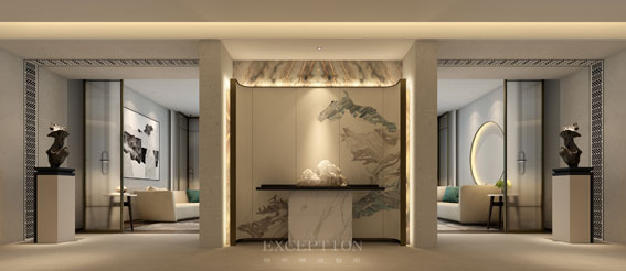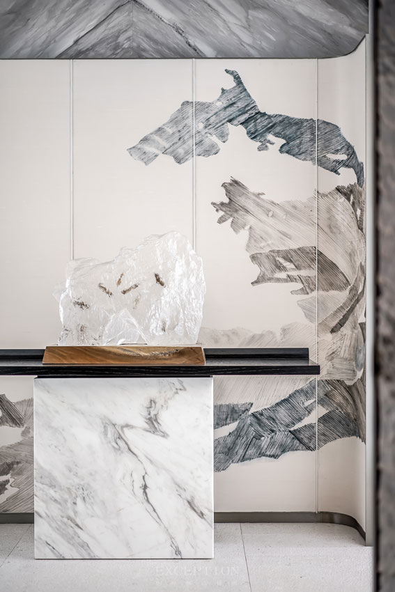 玄關(guān)正中的大理石墻前,是弧形絹絲手繪框畫,其上遒勁蒼枝的古樹描摹,與畫前剔透的水晶山石擺件、兩旁的寫實山石雕塑輕輕呼應(yīng),在溫煦的燈光下,空間縈繞著靜逸自然的氣韻。