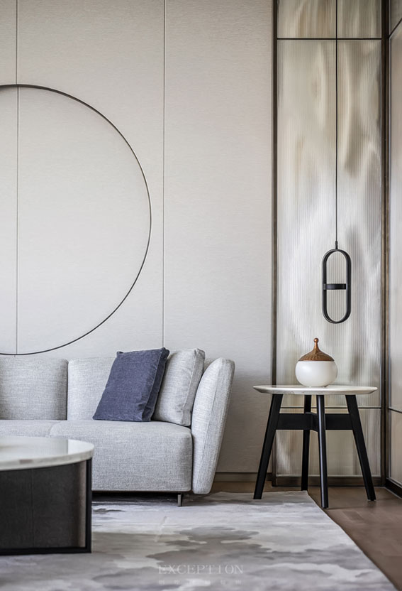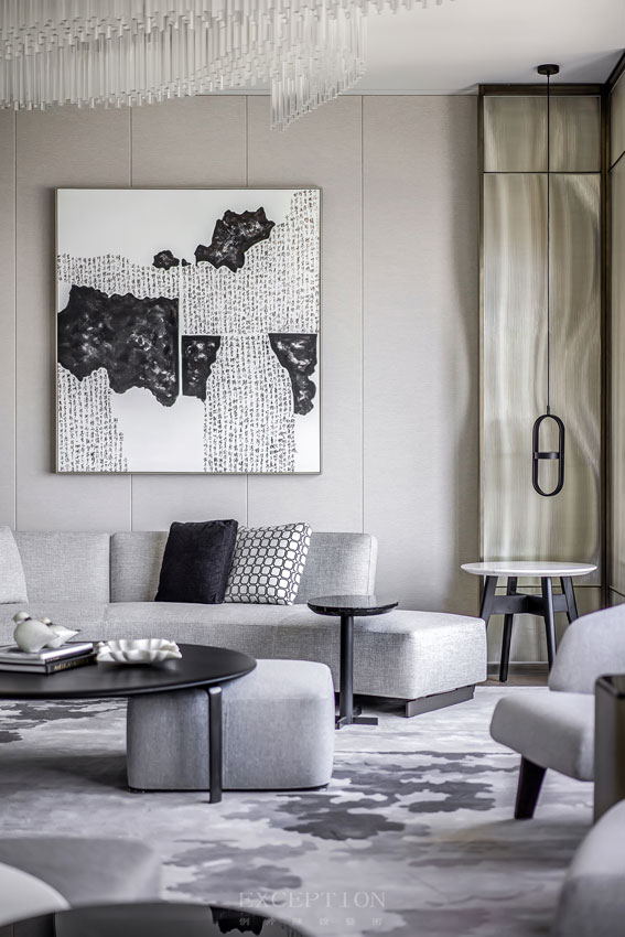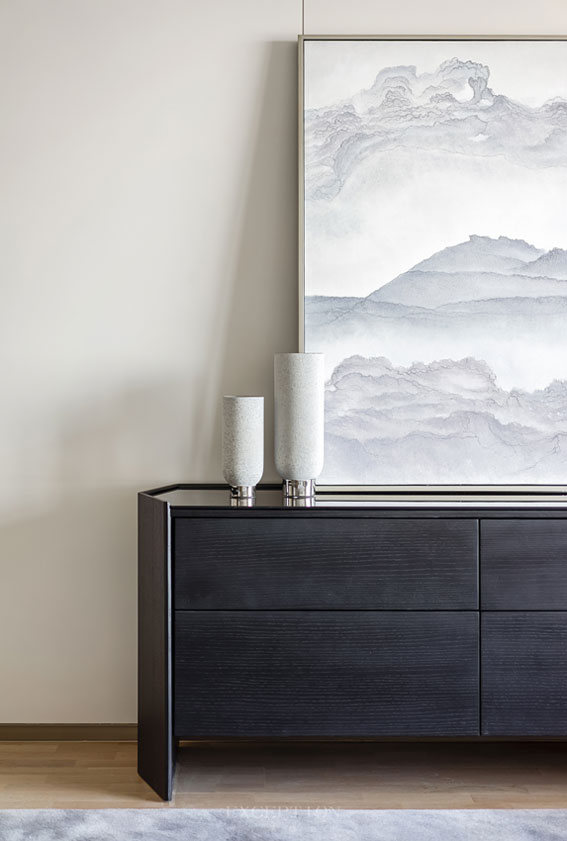 捫布墻面、定制家具、極簡燈具呈現(xiàn)簡練的線條感;灰白色地毯選取水墨云朵意象,搭配抽象山水掛畫的靜默感、水紋屏風(fēng)、圓月形燈帶、水晶吊燈那流水昱昱的意蘊,空間呈現(xiàn)自然的樸雅意趣,與屋主的品位不謀而合。