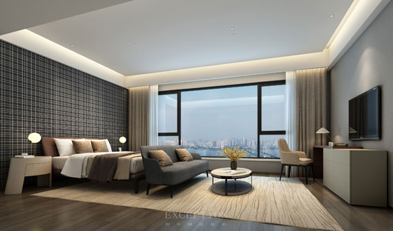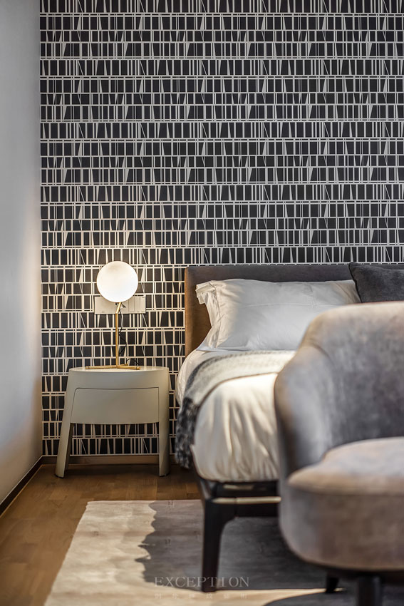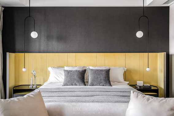 大面積的格紋黑白背景墻,與空間單一的深色調(diào)搭配相得益彰。細(xì)膩親膚的床品、開闊的視野享受,為親朋提供一個安靜雅致的休憩空間。
