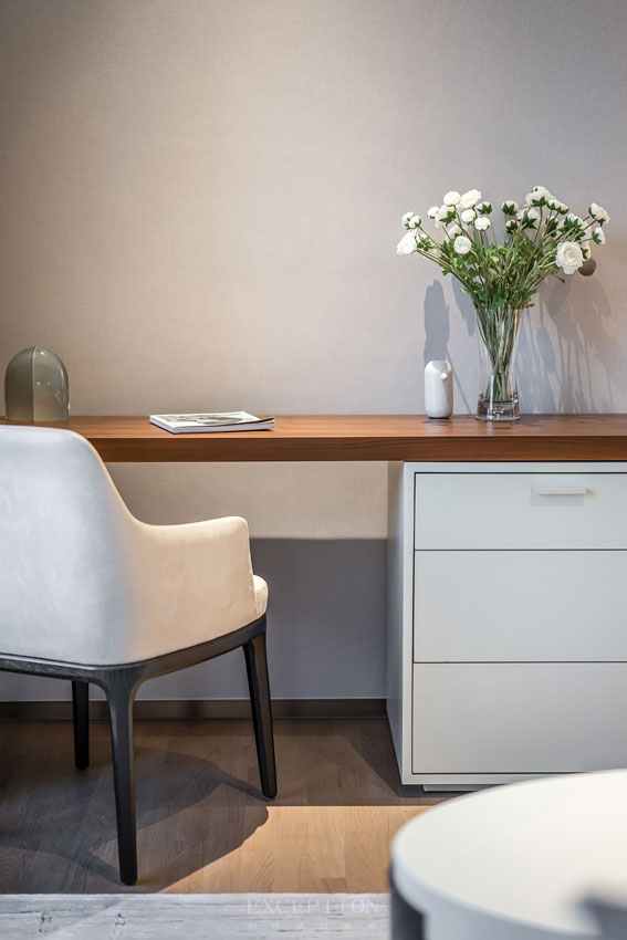 設(shè)計摒棄多余的造型和裝飾,以簡凈的語匯、米灰色的低調(diào)溫馨、品質(zhì)承襲的家具軟飾,拉近空間與生活的距離,打造一個美學(xué)體驗與生活溫度無間交融的居住空間。