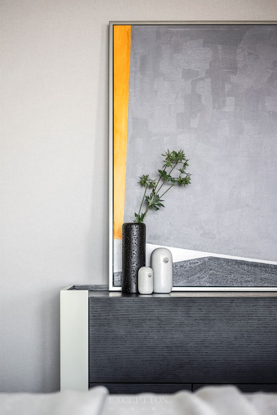 主臥空間低調(diào)柔和的配色與品質(zhì)家具,營造休息空間的簡凈高尚。極簡燈飾的不對稱搭配、藝術(shù)畫及抱枕上的色彩、地毯上山水倒影的紋樣,打破了空間的單調(diào)感,彰顯室內(nèi)別具一格的審美格調(diào)。