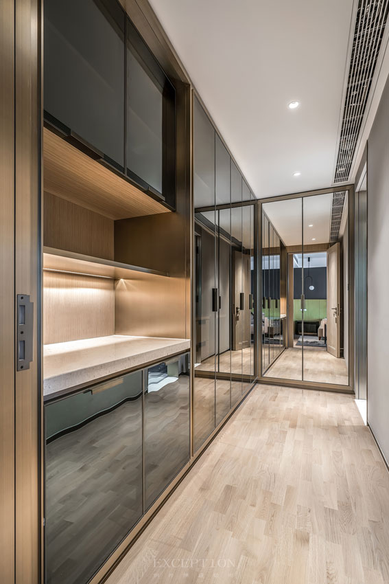 定制的Armani格紋櫥柜,定調(diào)空間的時尚輕奢之感,家具均采用同色系的簡約造型。